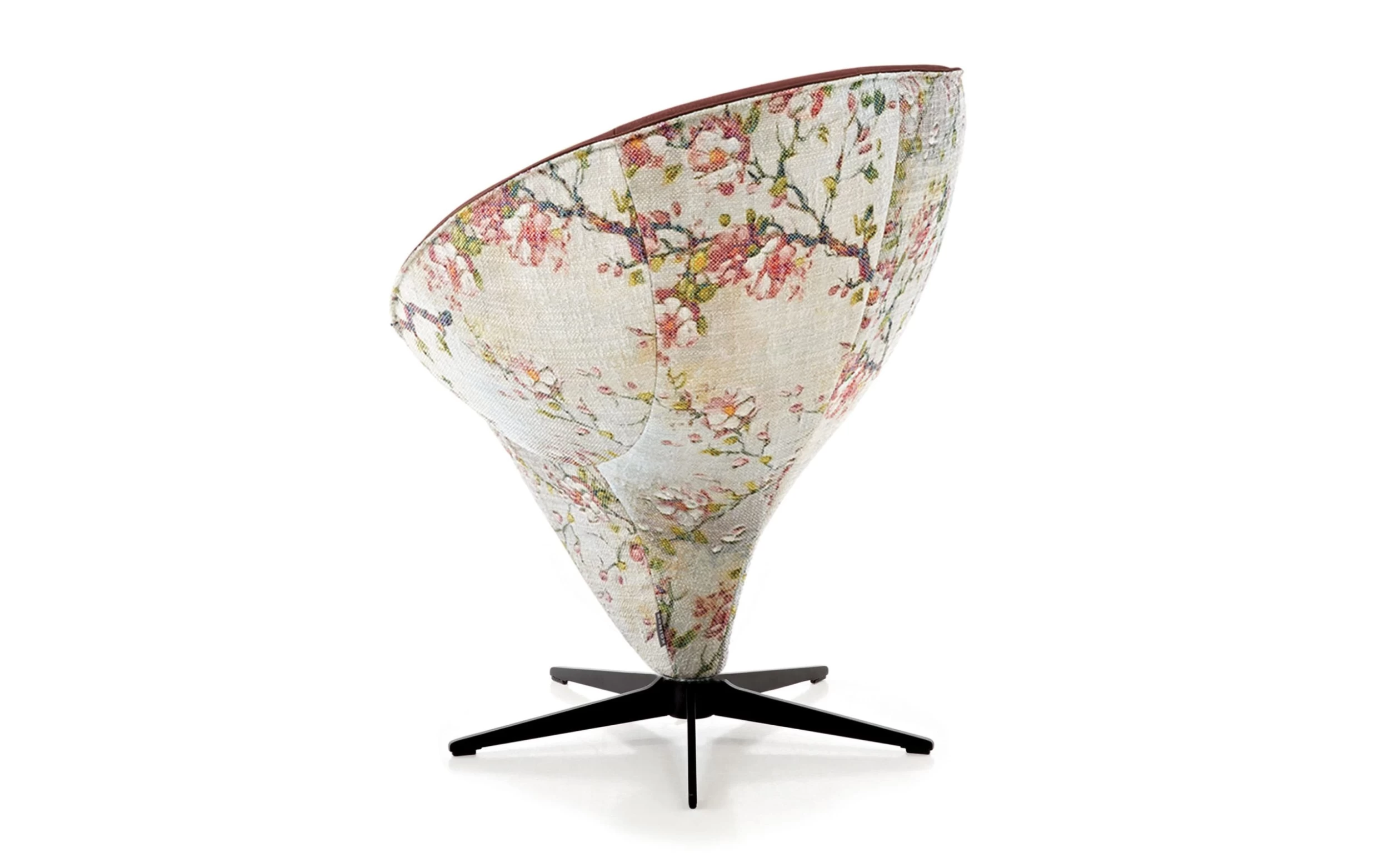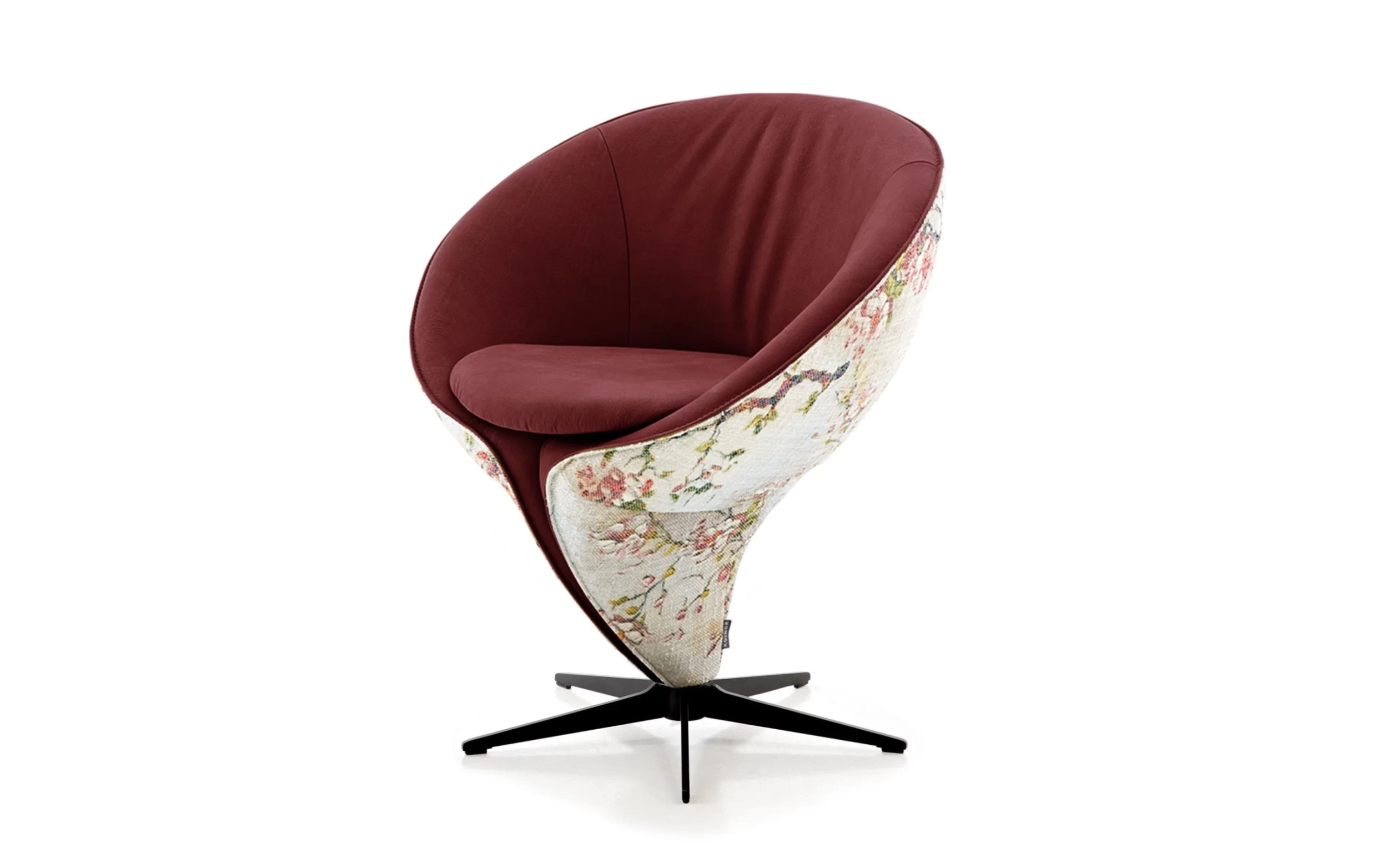 Ausführung mit Innenbezug aus pigmentiertem Leder in chilli, matte und leicht schimmernde Oberfläche, Außenbezug mit floralem Muster aus Flachgewebe, 5-Arm Metalldrehkreuz pulverbeschichtet in schwarz,