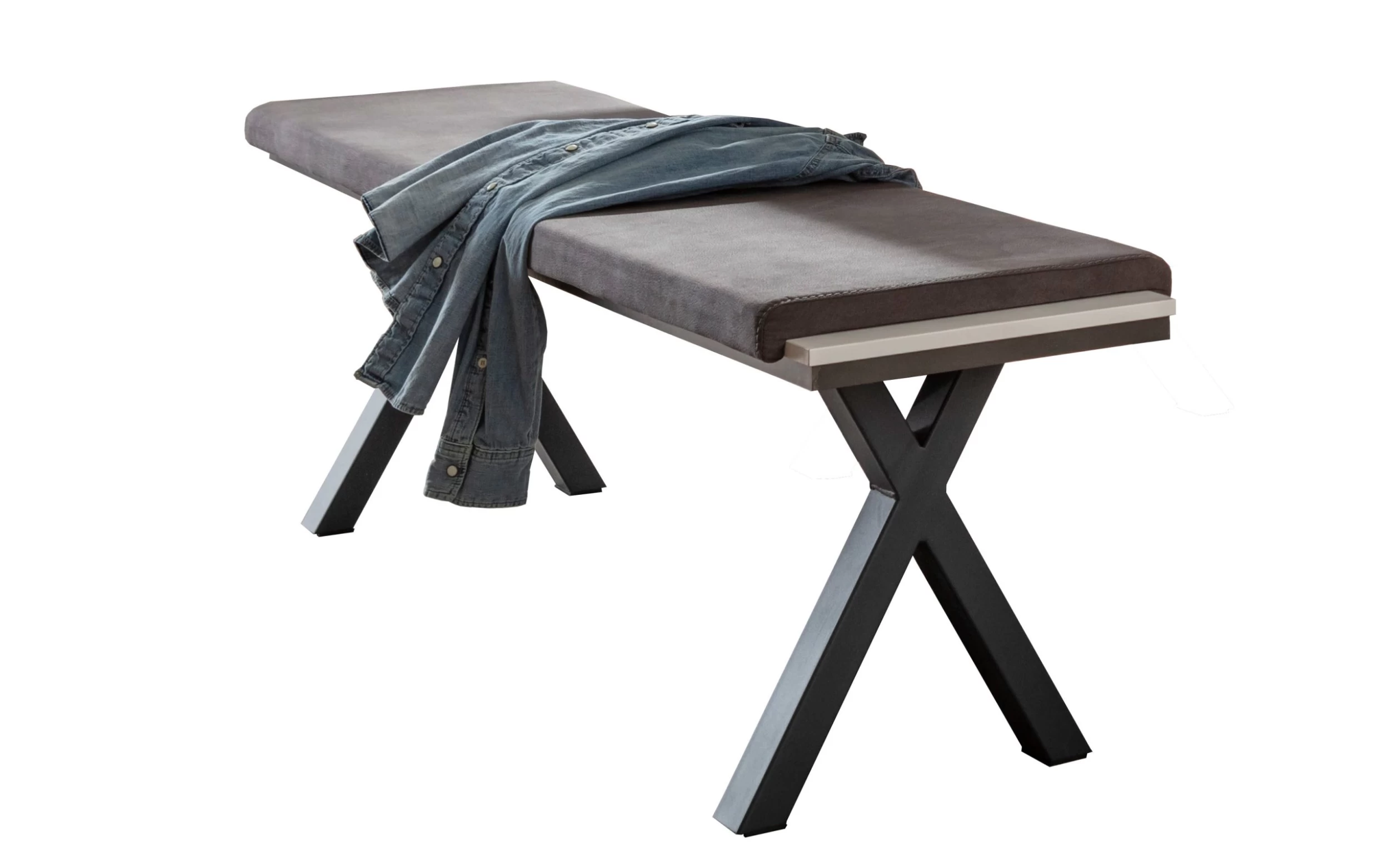 Ausführung in graphit & weiß supermatt, formschönes X-Gestell, inklusive Klemmkissen Leder Nachbildung in stahlgrau, B/H/T ca. 166 x 50 x 41 cm.