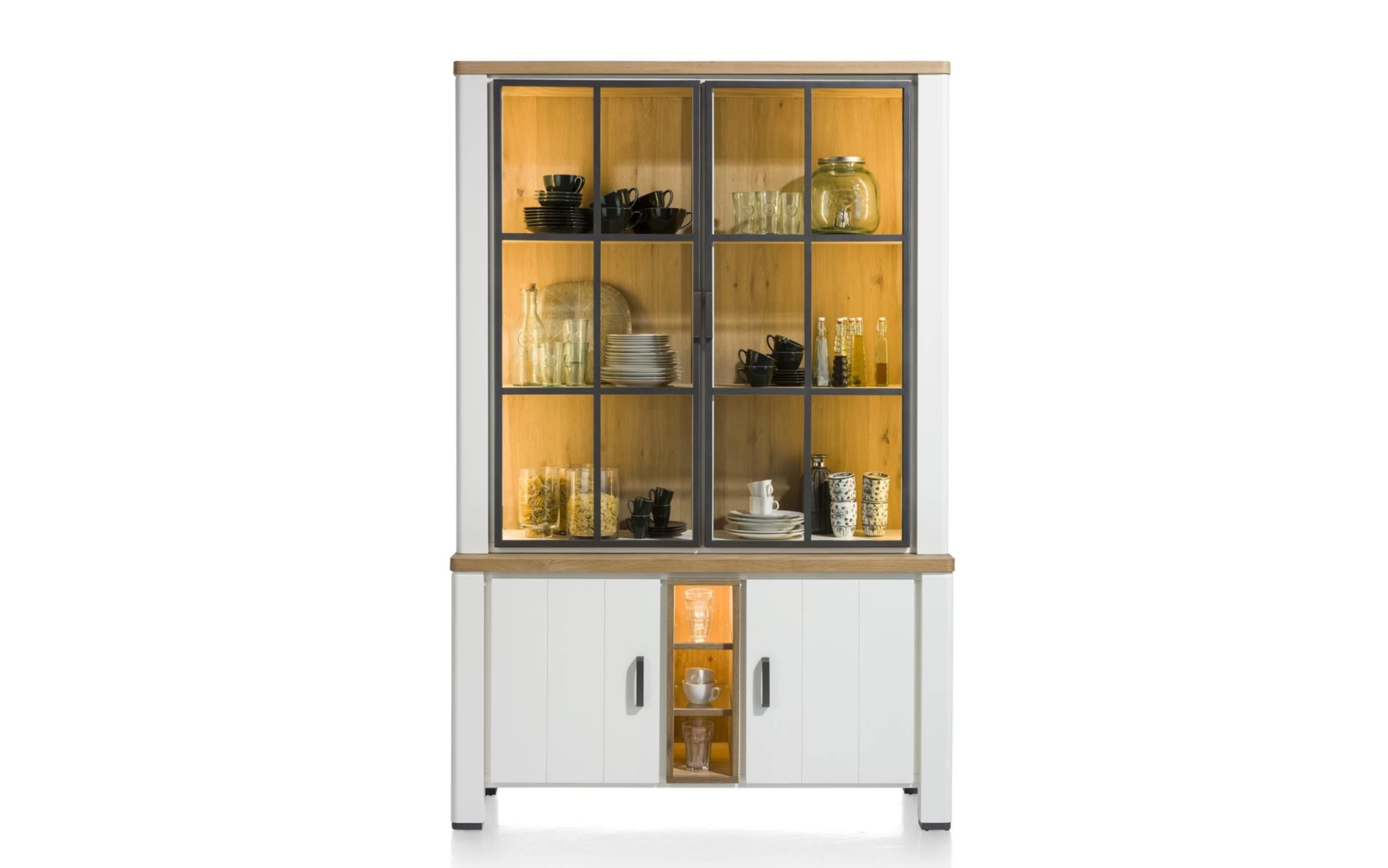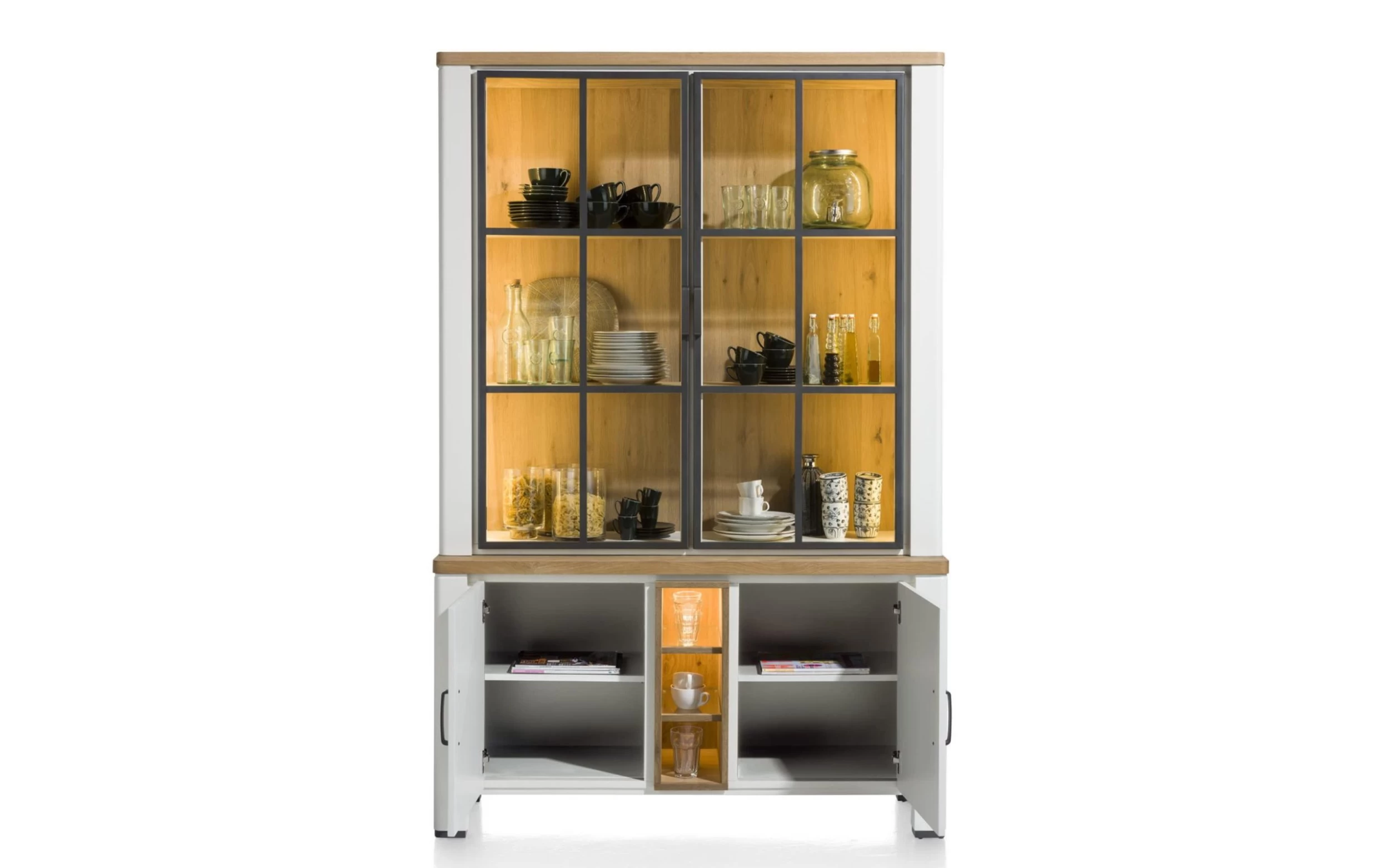 Ausführung aus MDF in weiß, Absetzung in Railway brown, 2 Türen, 2 Glastüren, 3 Nischen,