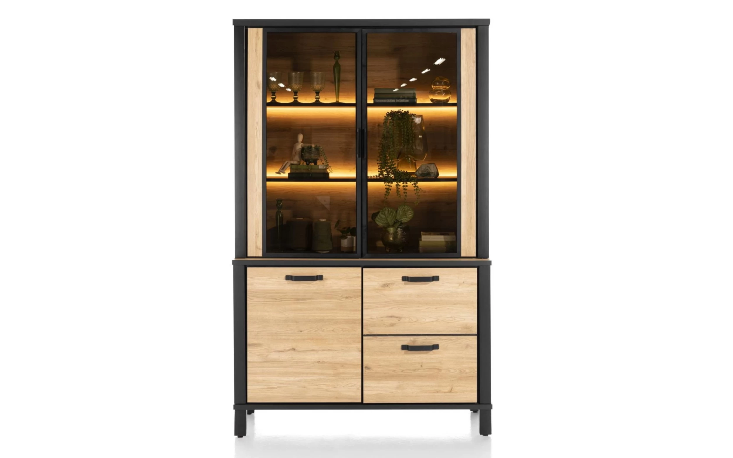 Ausführung in Laminato natural vintage, formschöne Griffe und Gestell aus Metall in off-black, 1 Tür, 2 Glastüren, 2 Schubkästen, inkl. LED-Beleuchtung,