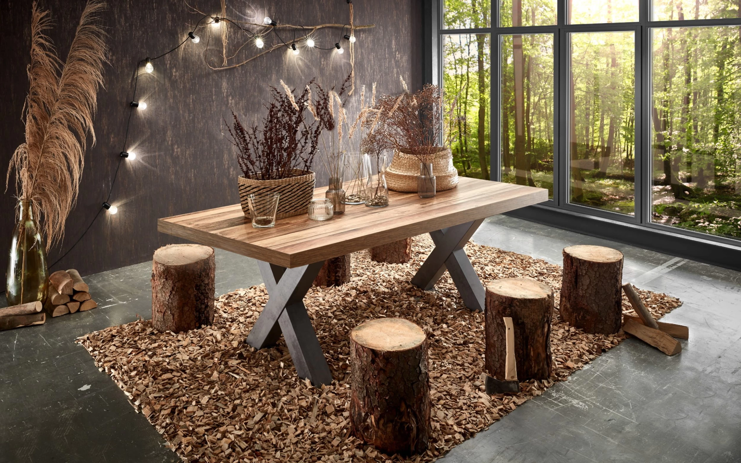 Ausführung der Tischplatte in Plankeneiche-Nachbildung, Melaminbeschichtet, formschönes X-Gestell in graphit, inklusive Ausziehfunktion,