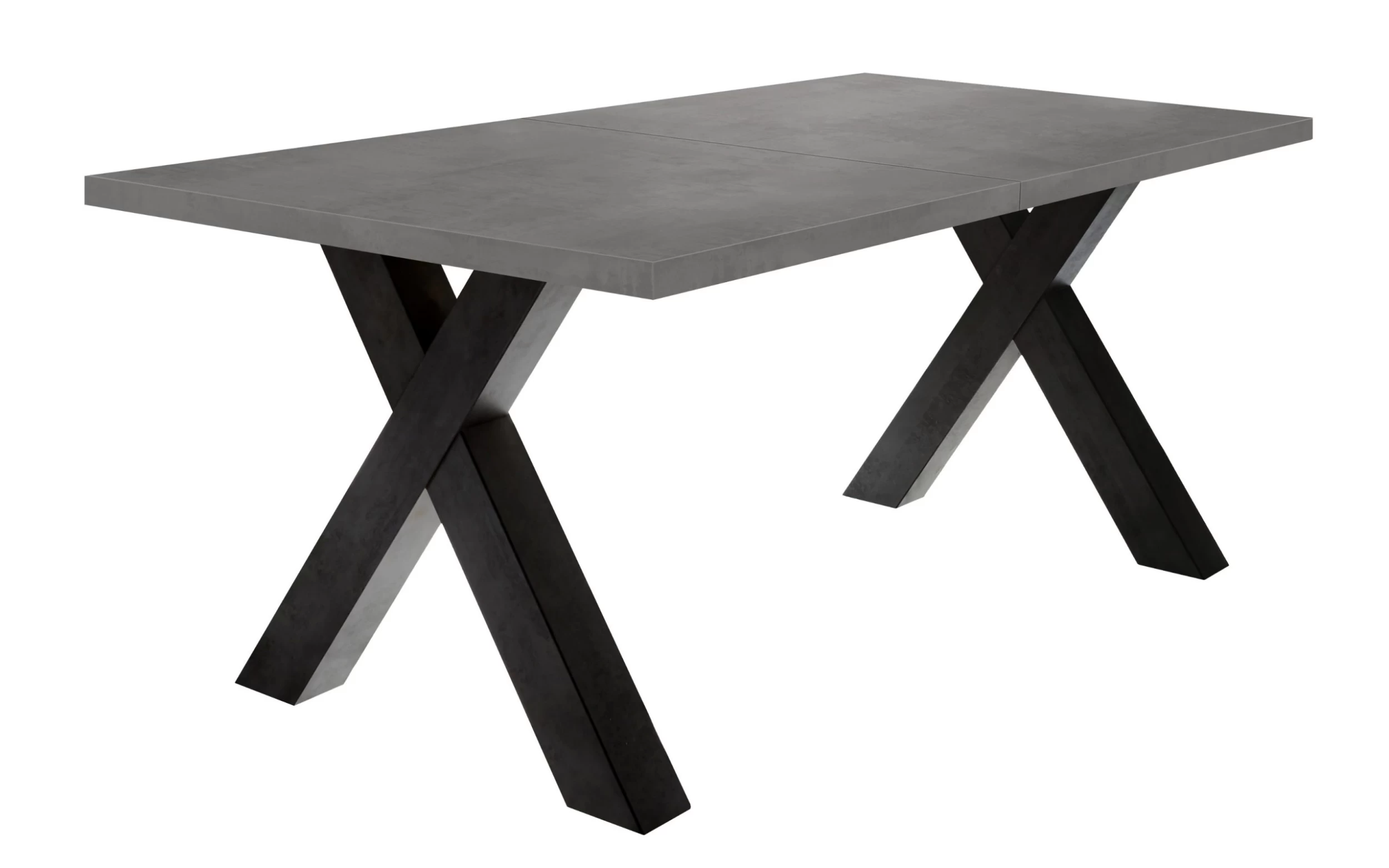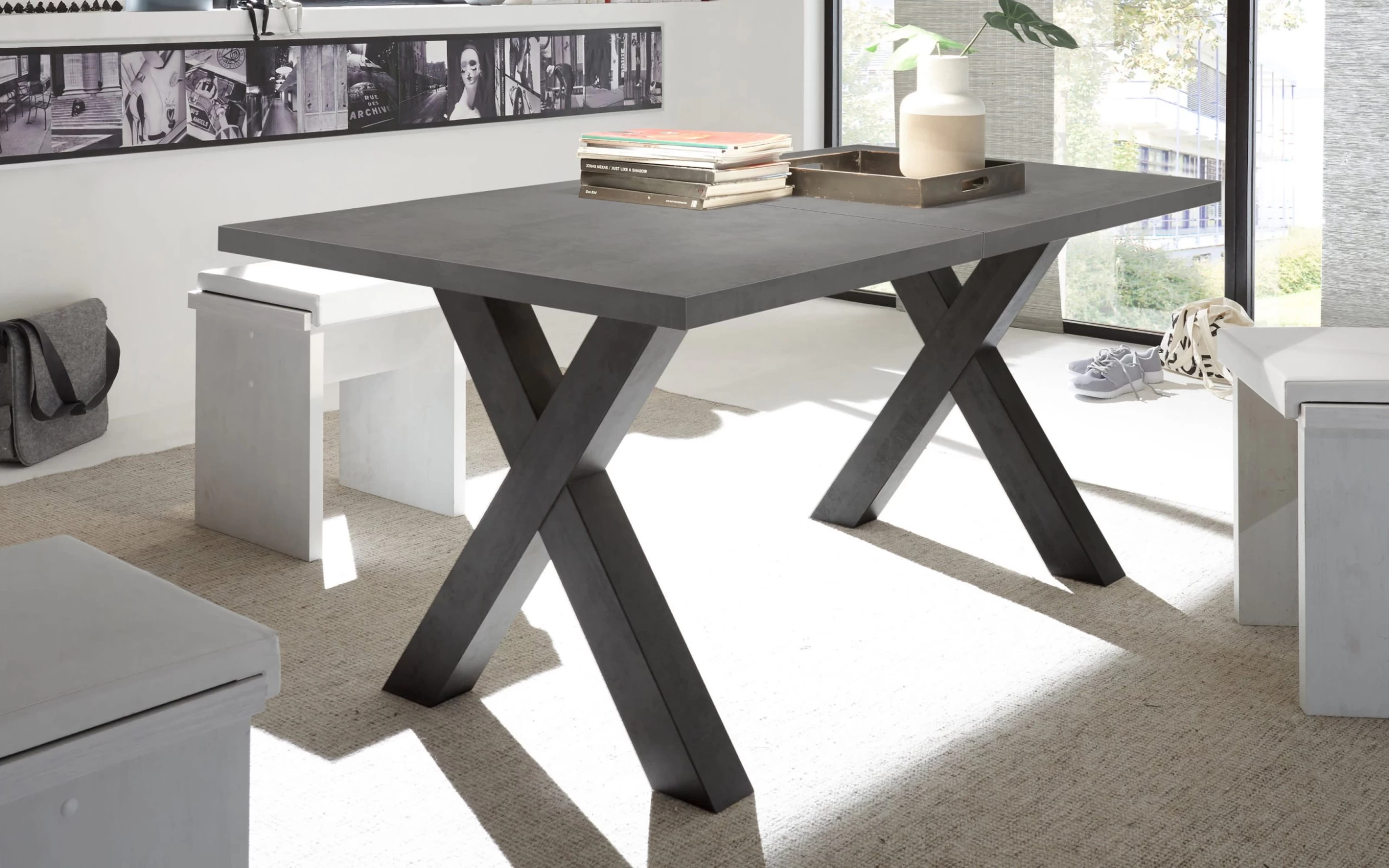Ausführung der Tischplatte aus MDF in graphit, formschönes X-Gestell aus Metall in schwarz, inklusive Ausziehfunktion, L/H/T ca. 140 – 190 x 77 x 90 cm.