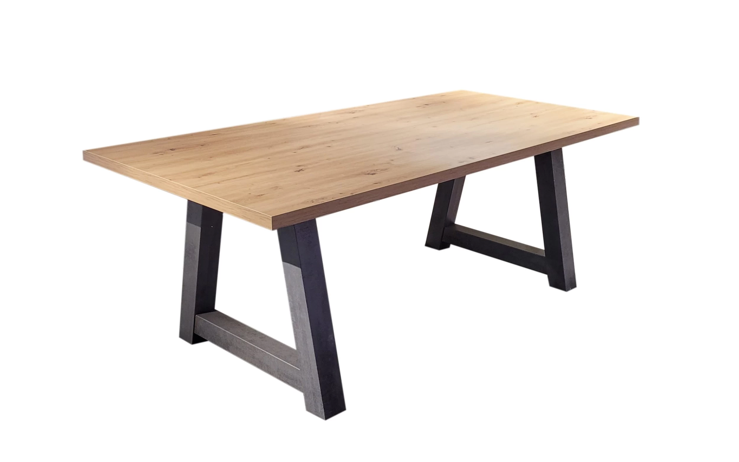 Ausführung der Tischplatte in Asteiche Nachbildung, formschönes Gestell aus Metall in graphit,
