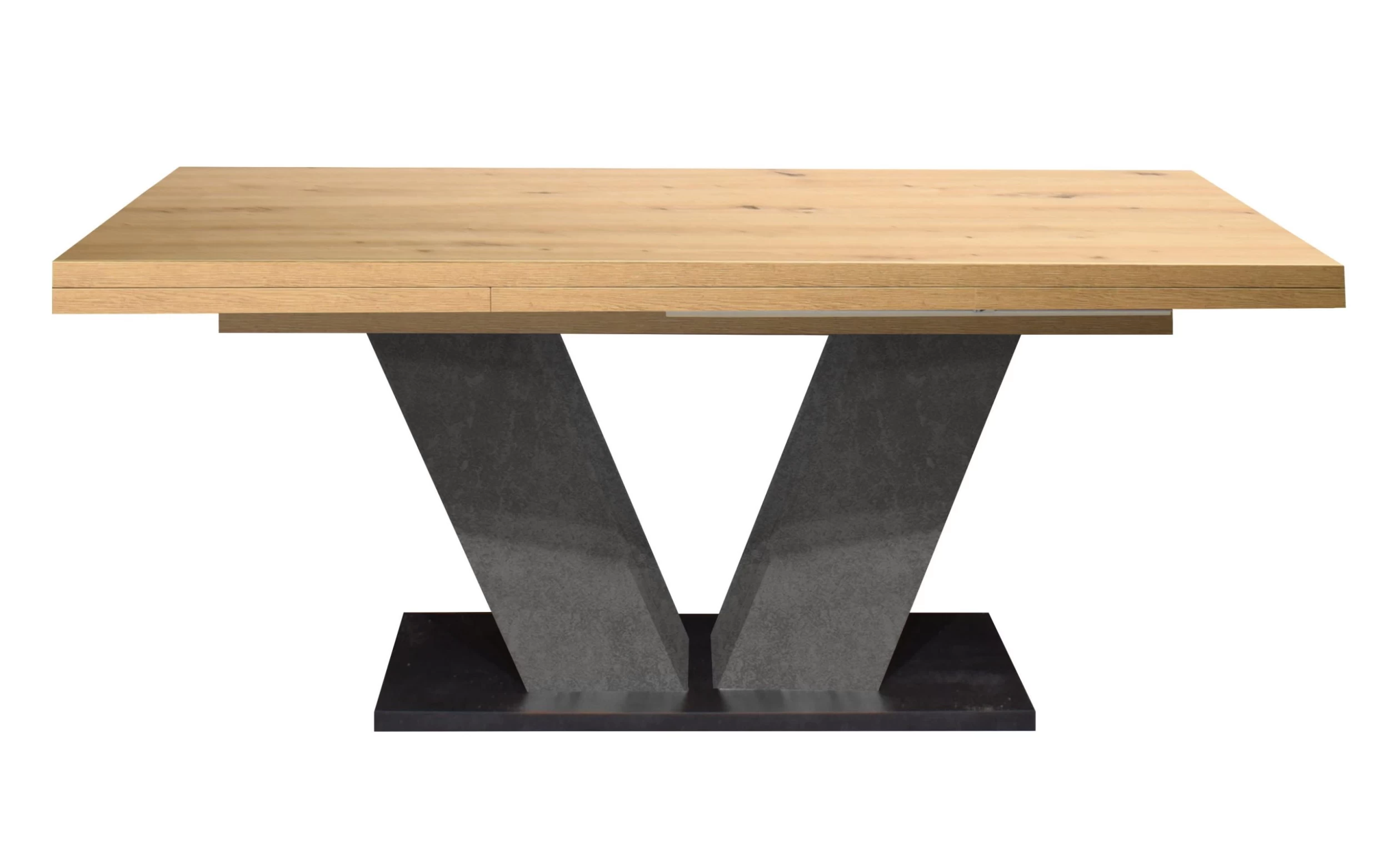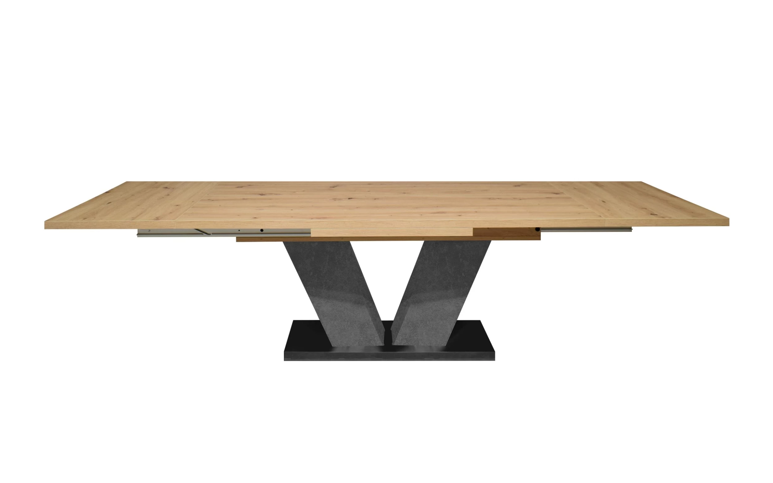 Ausführung der Tischplatte in Asteiche Nachbildung, V-Säule als Gestell in graphit, Bodenplatte in schwarzstahl Farbig, inklusive Ausziehfunktion,