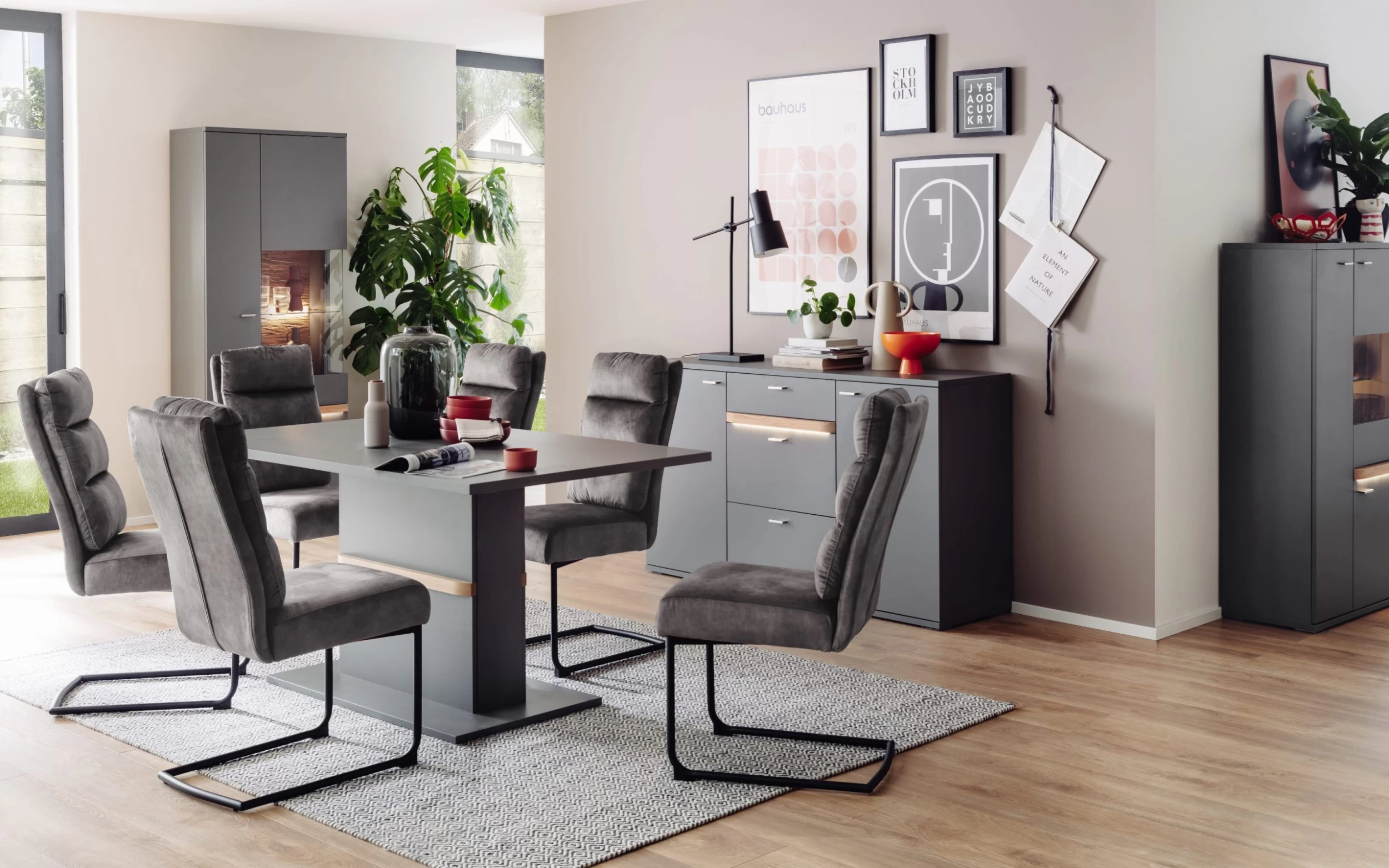 Ausführung in Royal grey, Absetzung in Balkeneiche massiv geölt, L/H/T ca. 160 x 77 x 90 cm.