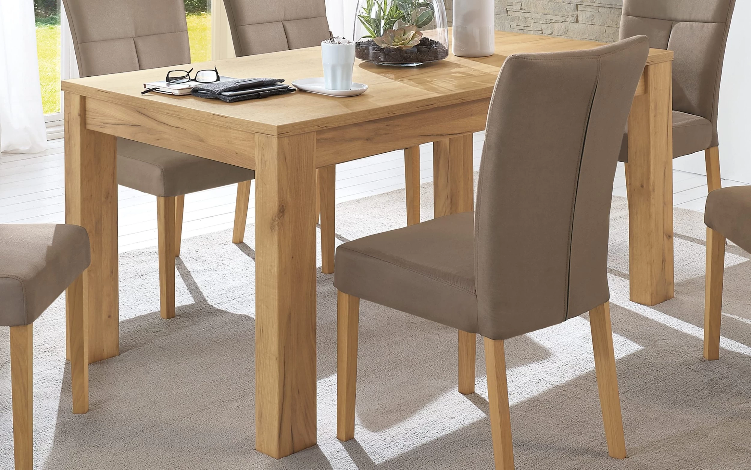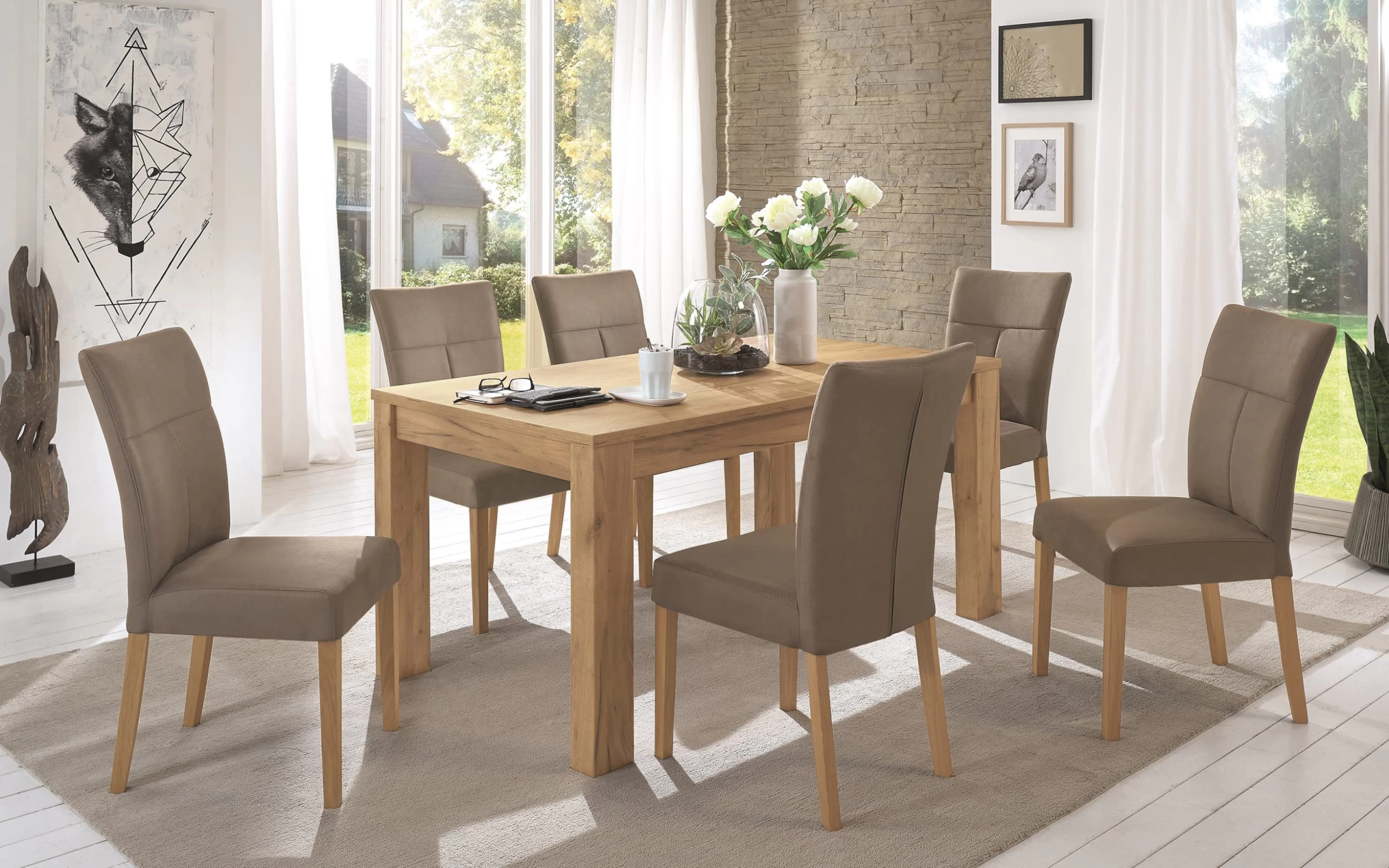 Ausführung mit Tischplatte und 4-Fuß-Gestell in Eiche-Terra-Nachbildung, inklusive einer Falteinlage von 70 cm zur praktischen Erweiterung der Tischfläche.