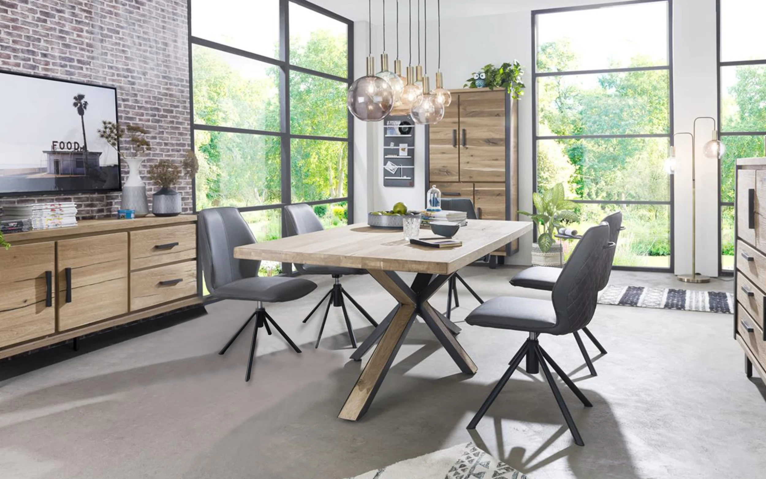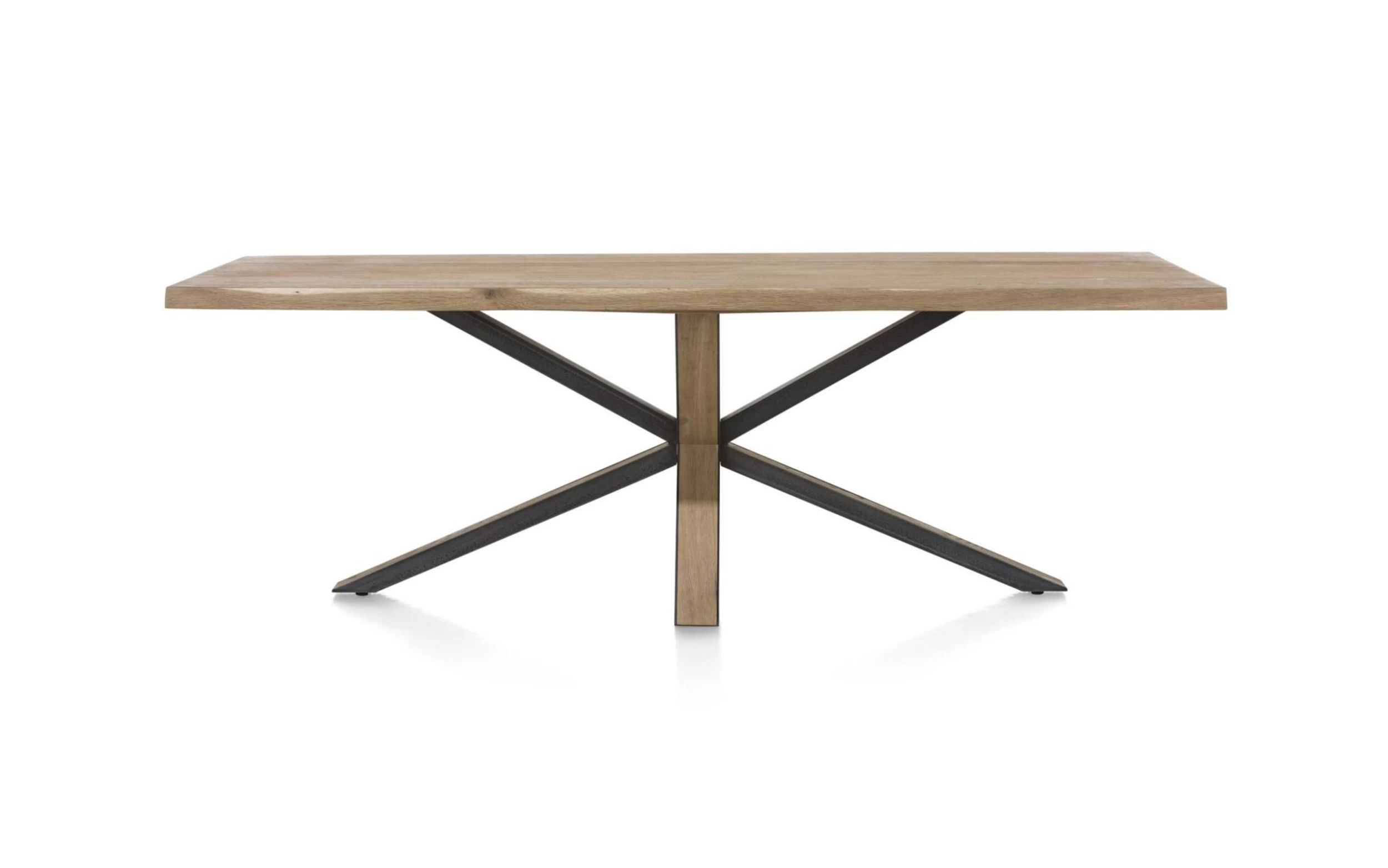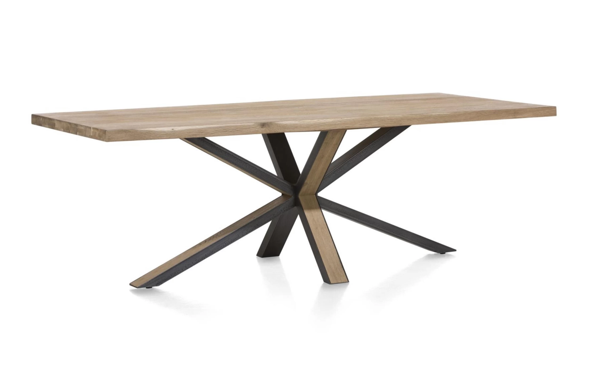 Ausführung der Tischplatte in Eiche Railway brown Furnier, Gestell aus Metall mit Holzeinlagen,