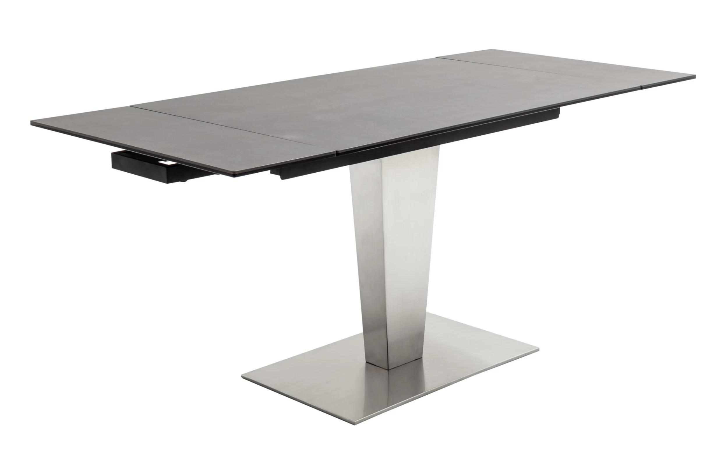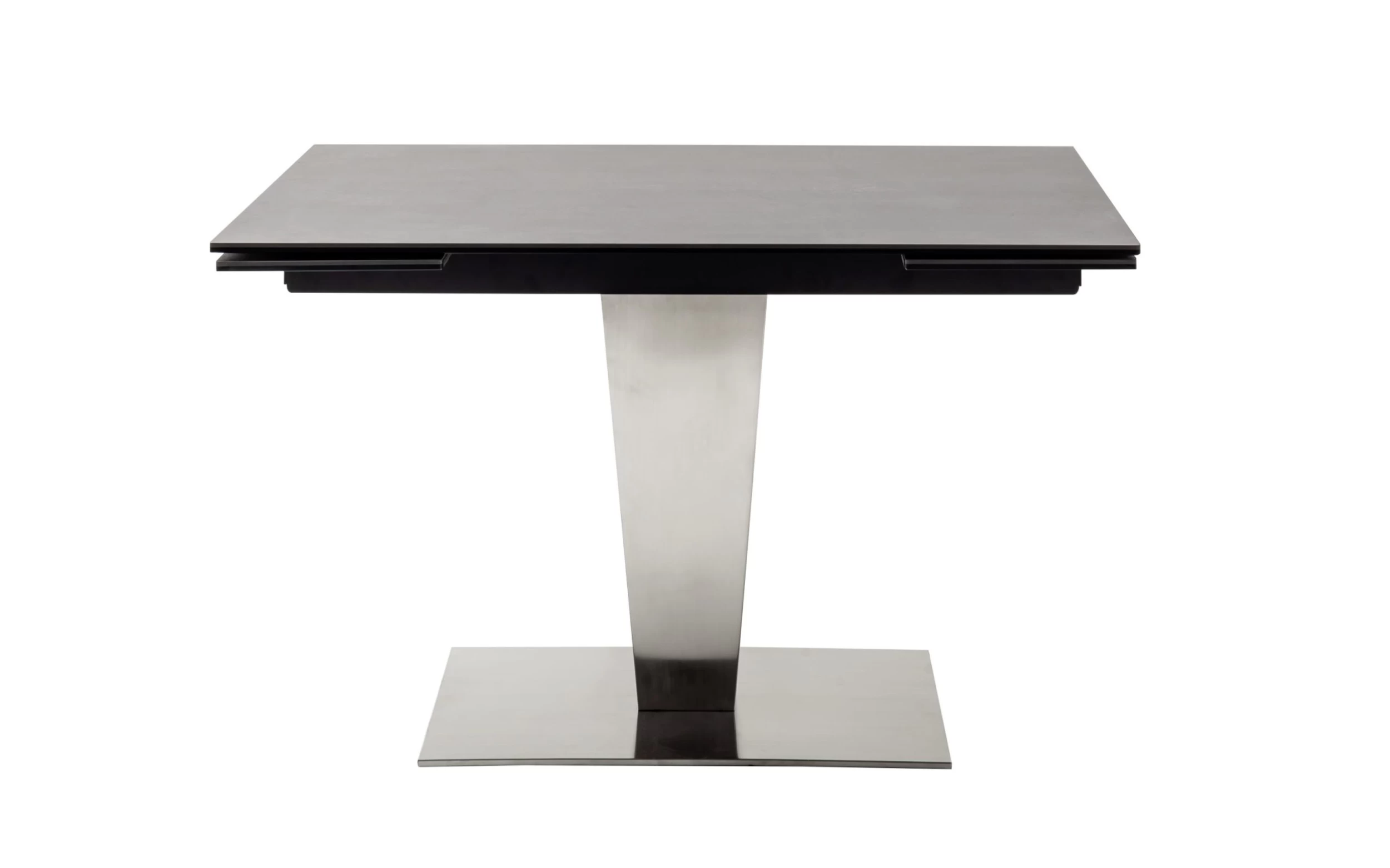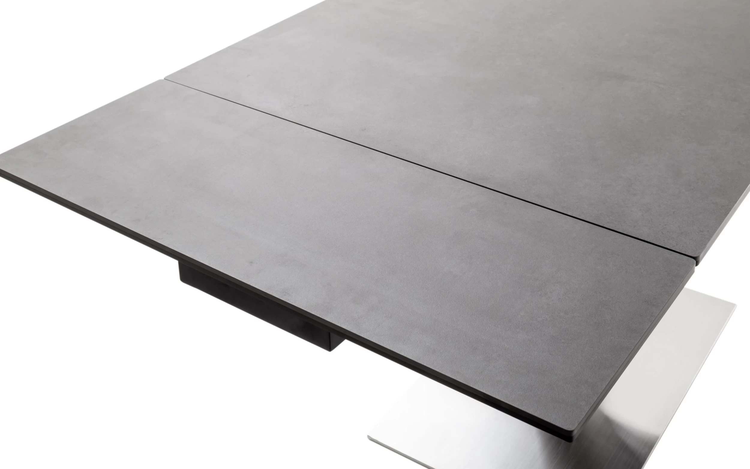 Ausführung der Tischplatte aus Keramik und Sicherheitsglas 14 mm in schwarz lackiert, Säule und Bodenplatte Edelstahl gebürstet, inklusive Synchronauszug,