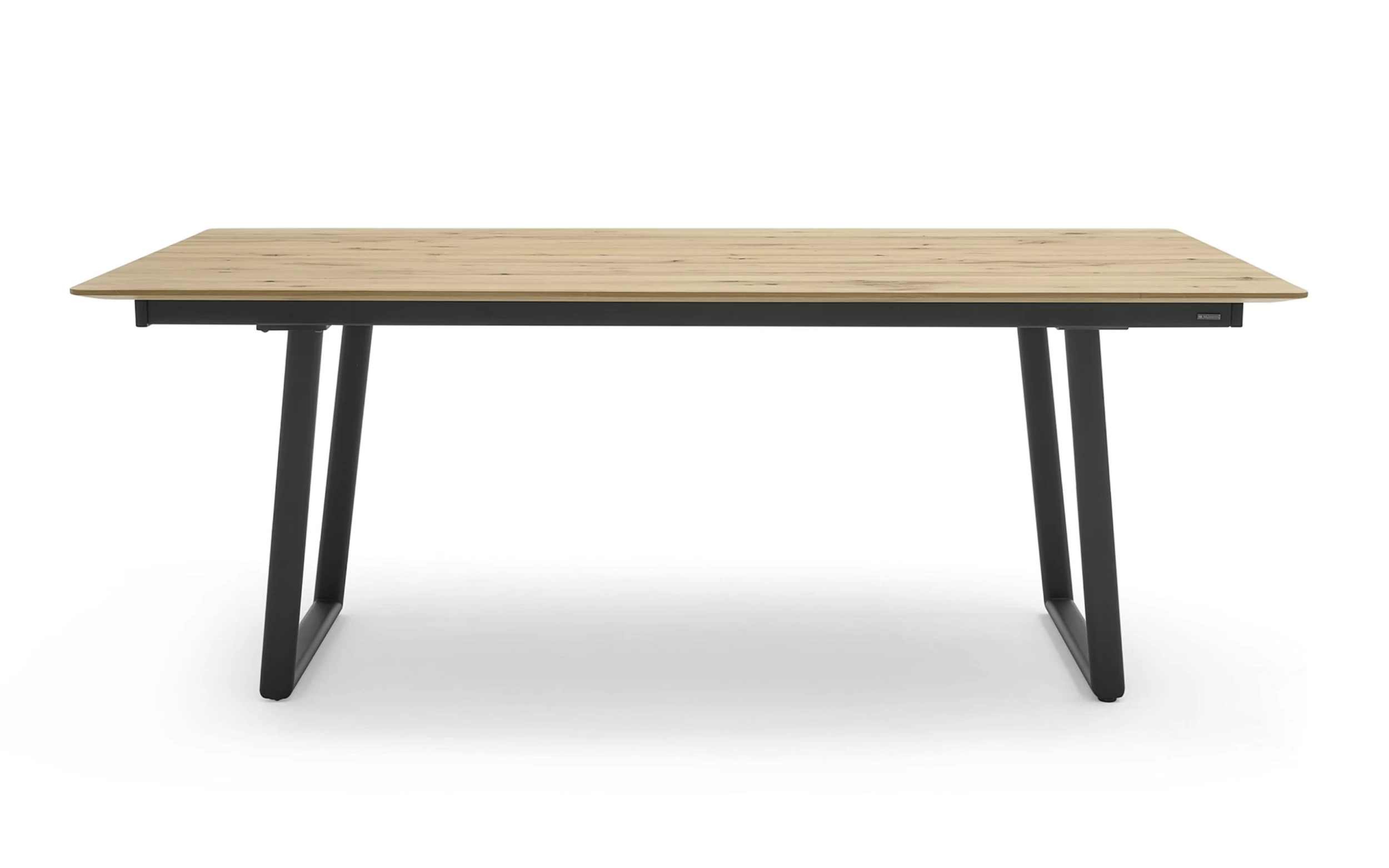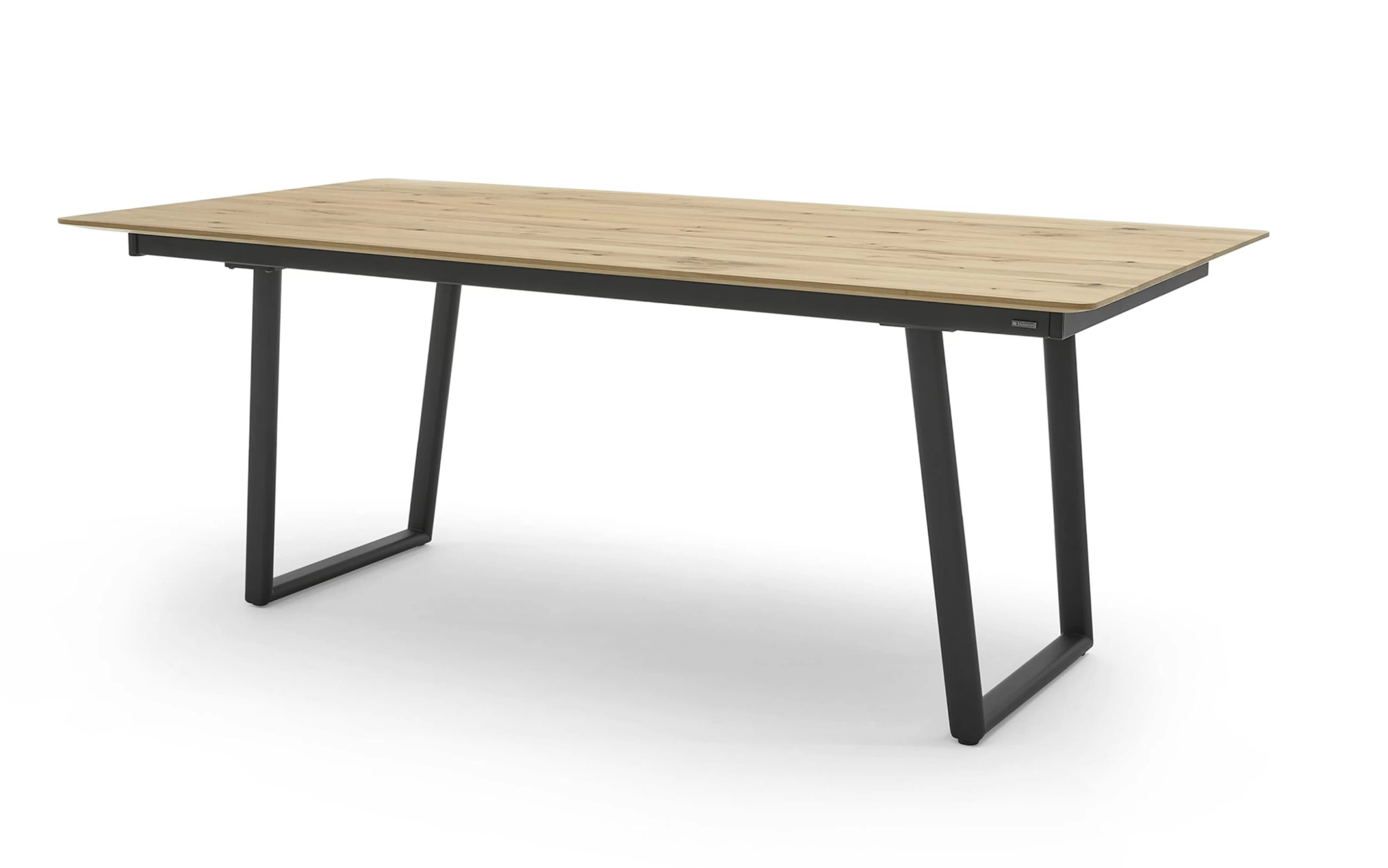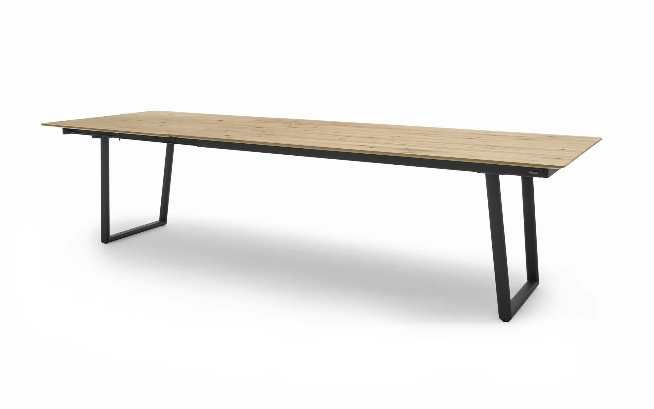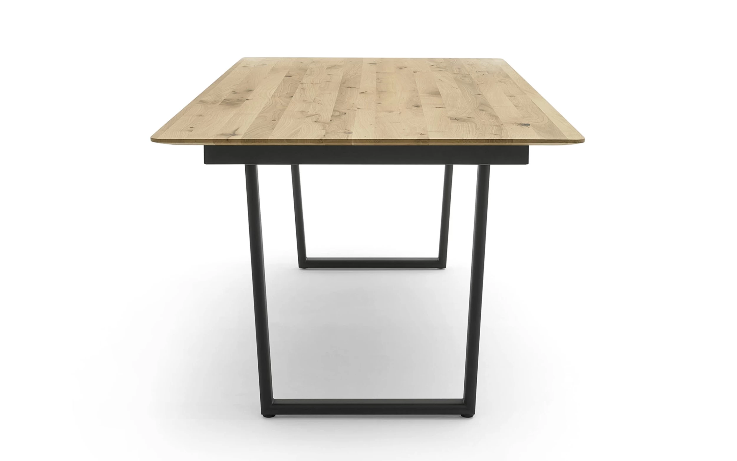 Ausführung der Tischplatte in Wildeiche massiv, Gestell aus Metall in schwarz pulverbeschichtet,