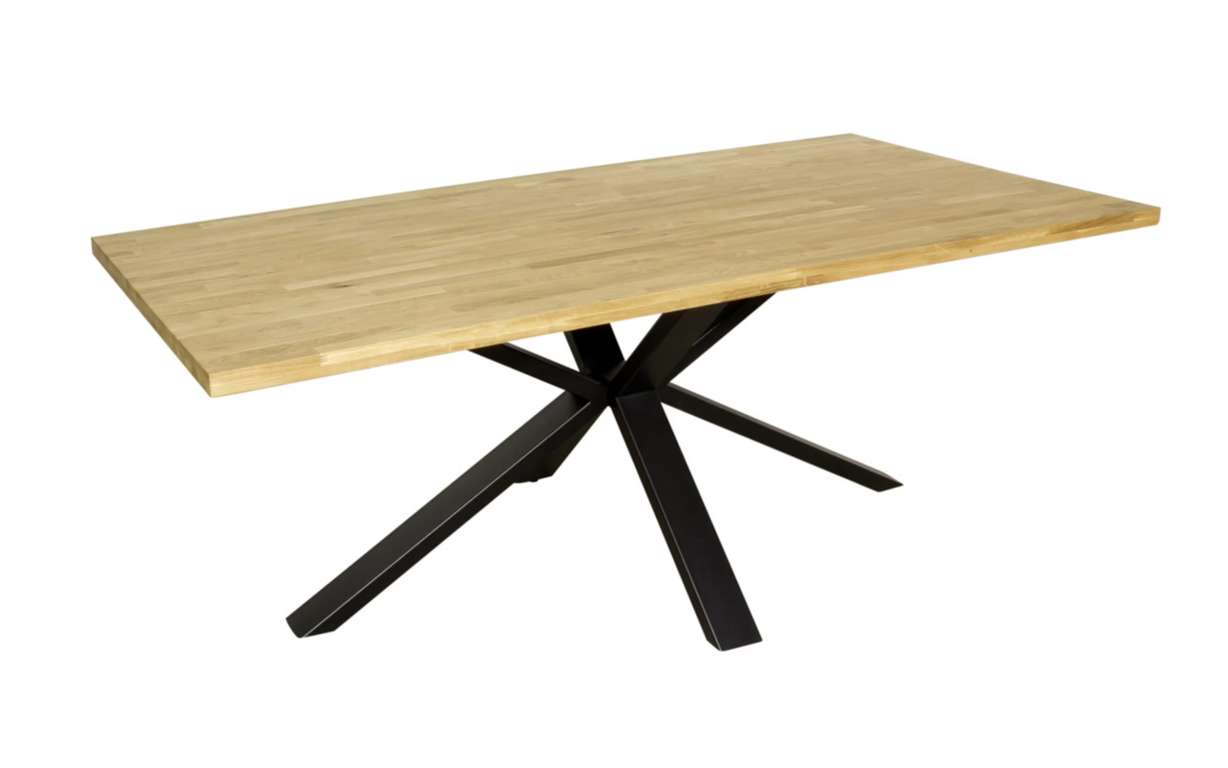 Ausführung der Tischplatte in Eiche geölt keilverzinkt, Plattenstärke ca. 4 cm, formschönes Spyder Gestell aus Metall in schwarz,