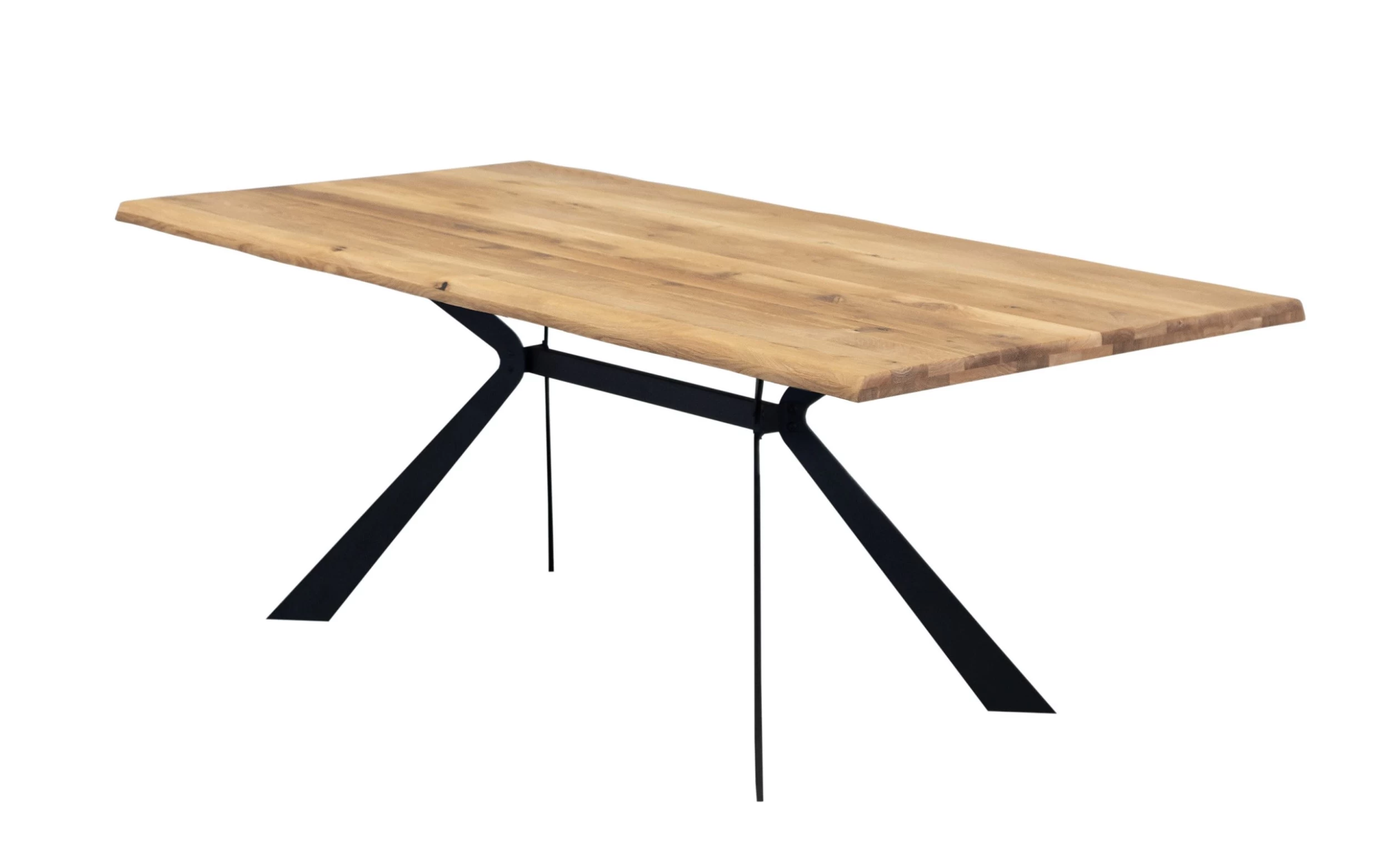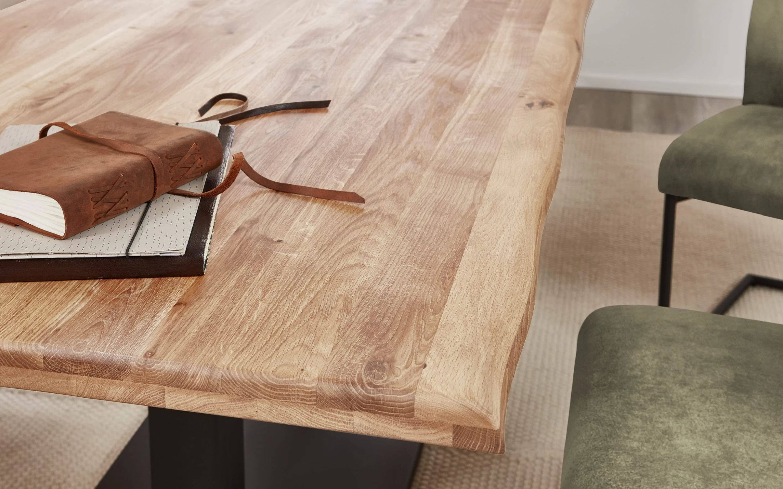 Ausführung mit Tischplatte aus massiver Eiche mit Baumkante, Gestell aus Metall in schwarz gepulvert,