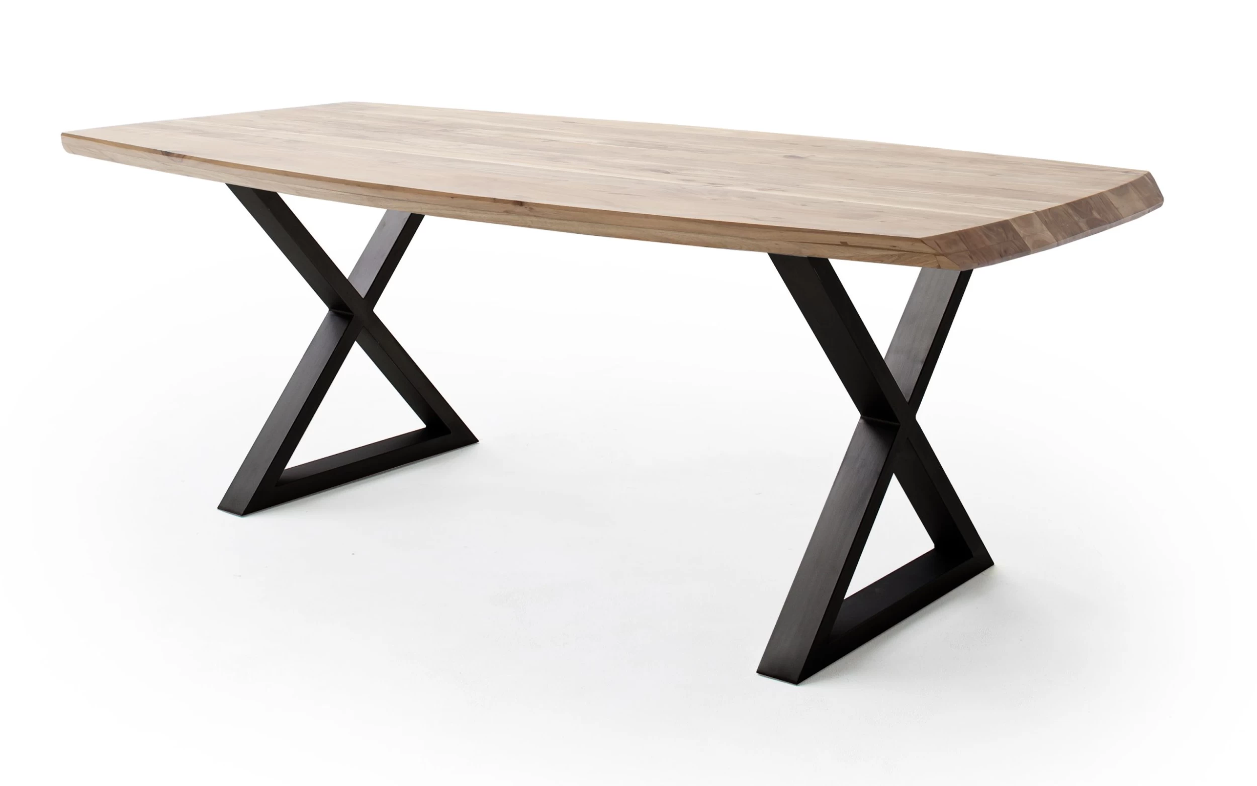 Ausführung der Tischplatte aus Akazie massiv natur geölt, formschönes X-Form Gestell aus Metall in anthrazit lackiert,
