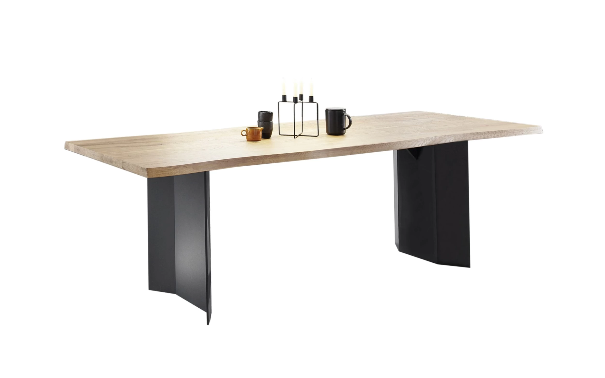 Ausführung in Kernesche massiv anthrazit gebeizt, mit fester Platte, Tischkante mit Baumkantenprofil.