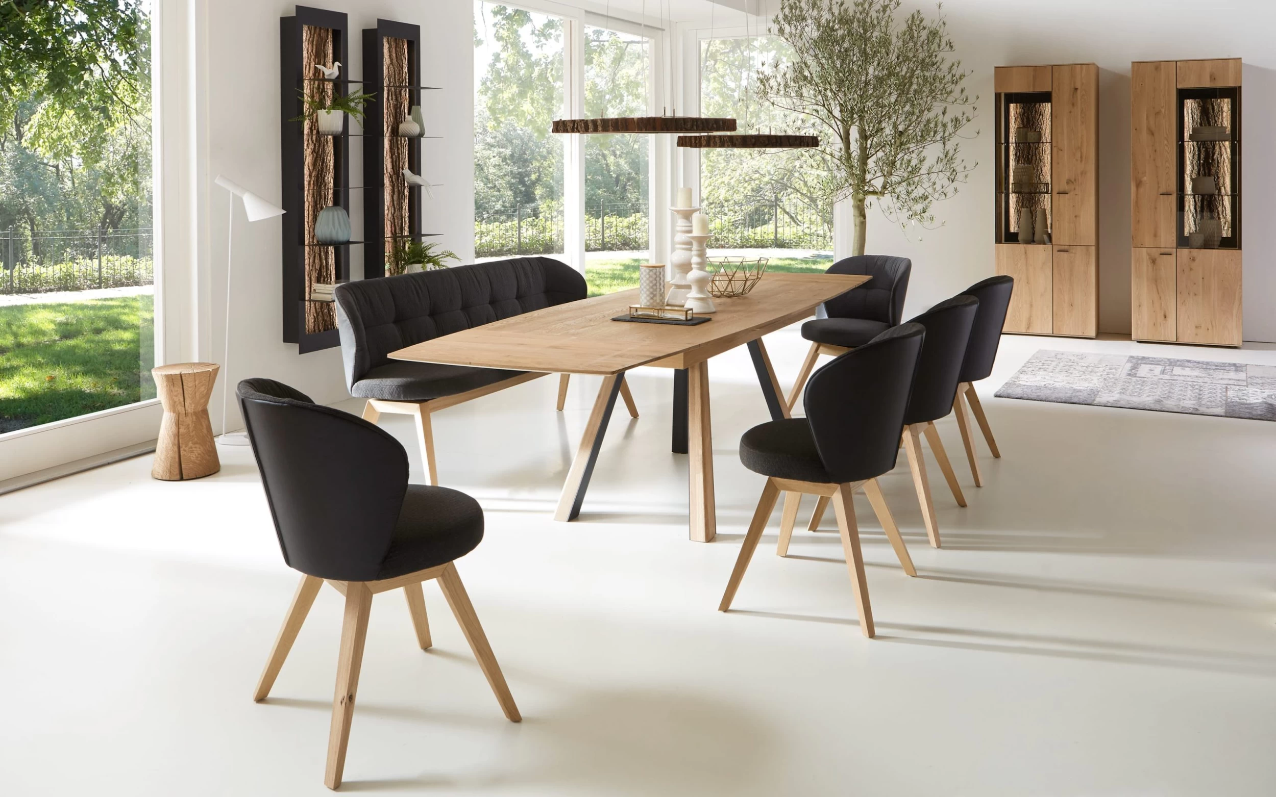 Ausführung mit Außenbezug aus echtem Leder in schwarz und Innenbezug aus Stoff in anthrazit, Gestell aus Kerneiche, natur, gebürstet,