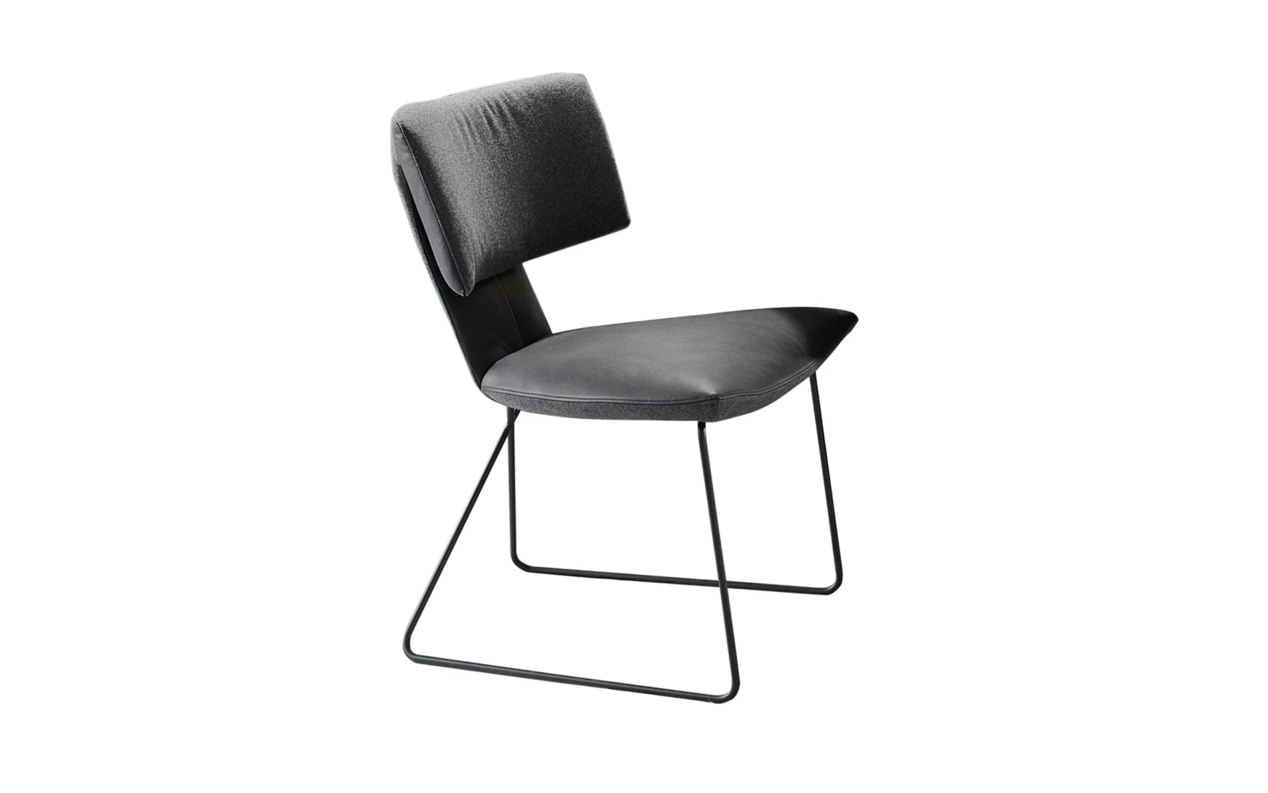 Ausführung Metallgestell in anthrazit, Rückenpolster Stoffbezug in dunkelgrau, Sitzfläche mit Leder bezogen in schwarz.