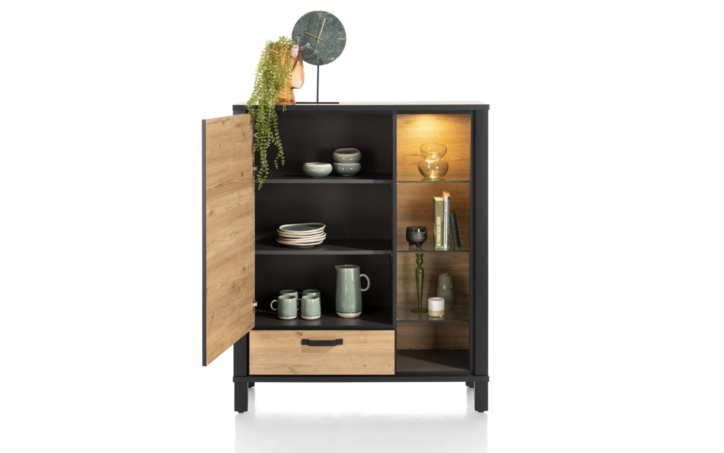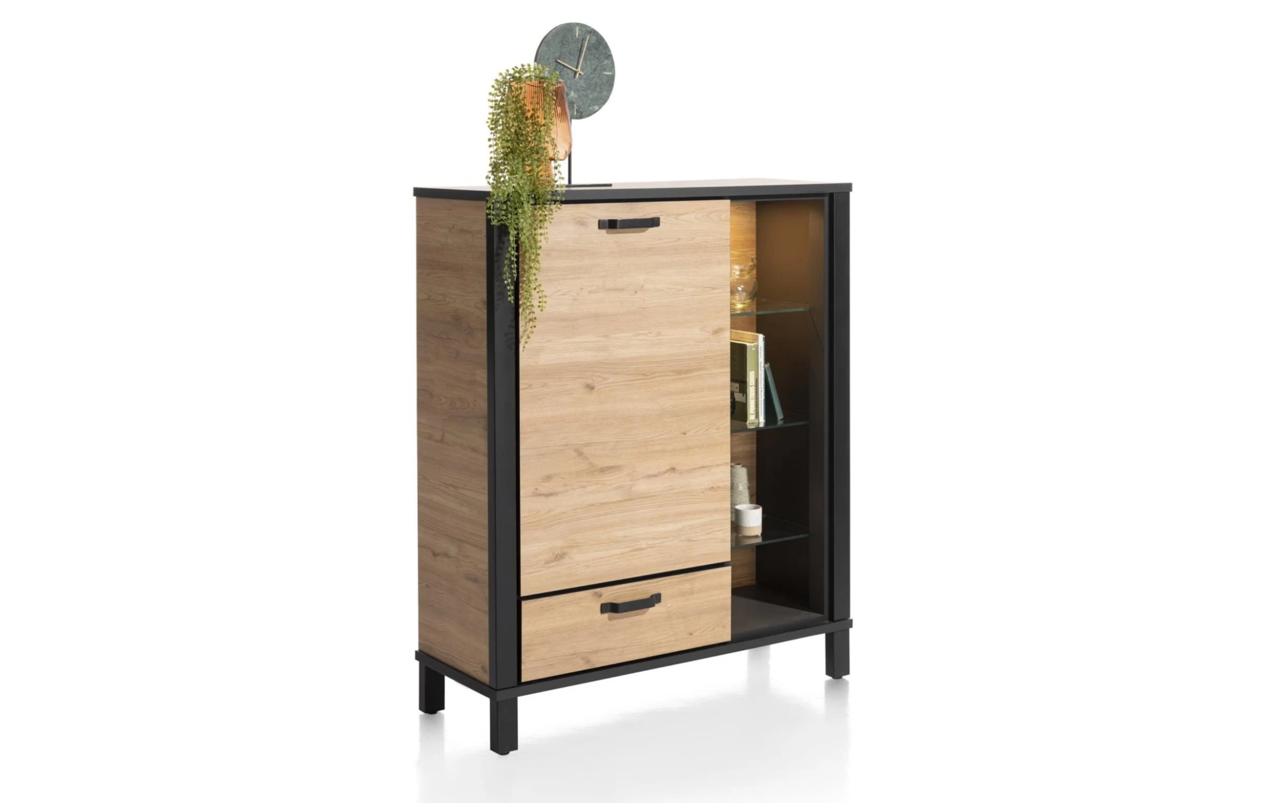 Ausführung in Laminato natural vintage, formschöne Griffe und Gestell aus Metall in off-black, 1 Tür, 1 Schubkästen und 4 offene Fächer, inkl. LED-Beleuchtung,