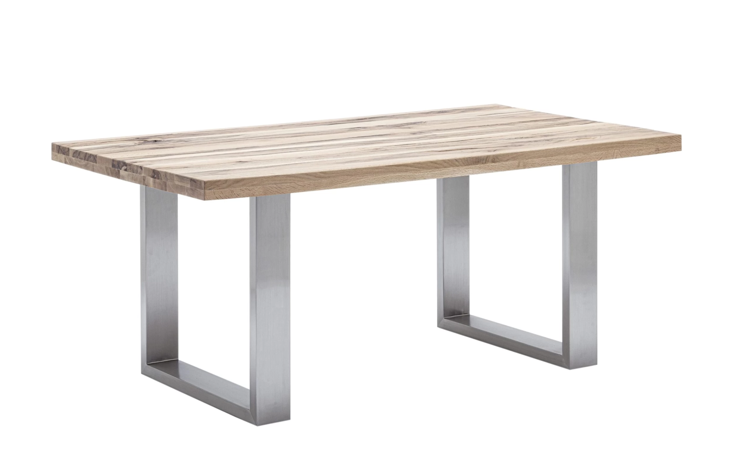 Ausführung der Tischplatte in Wildeiche massiv lackiert, Gestell in Edelstahl gebürstet,