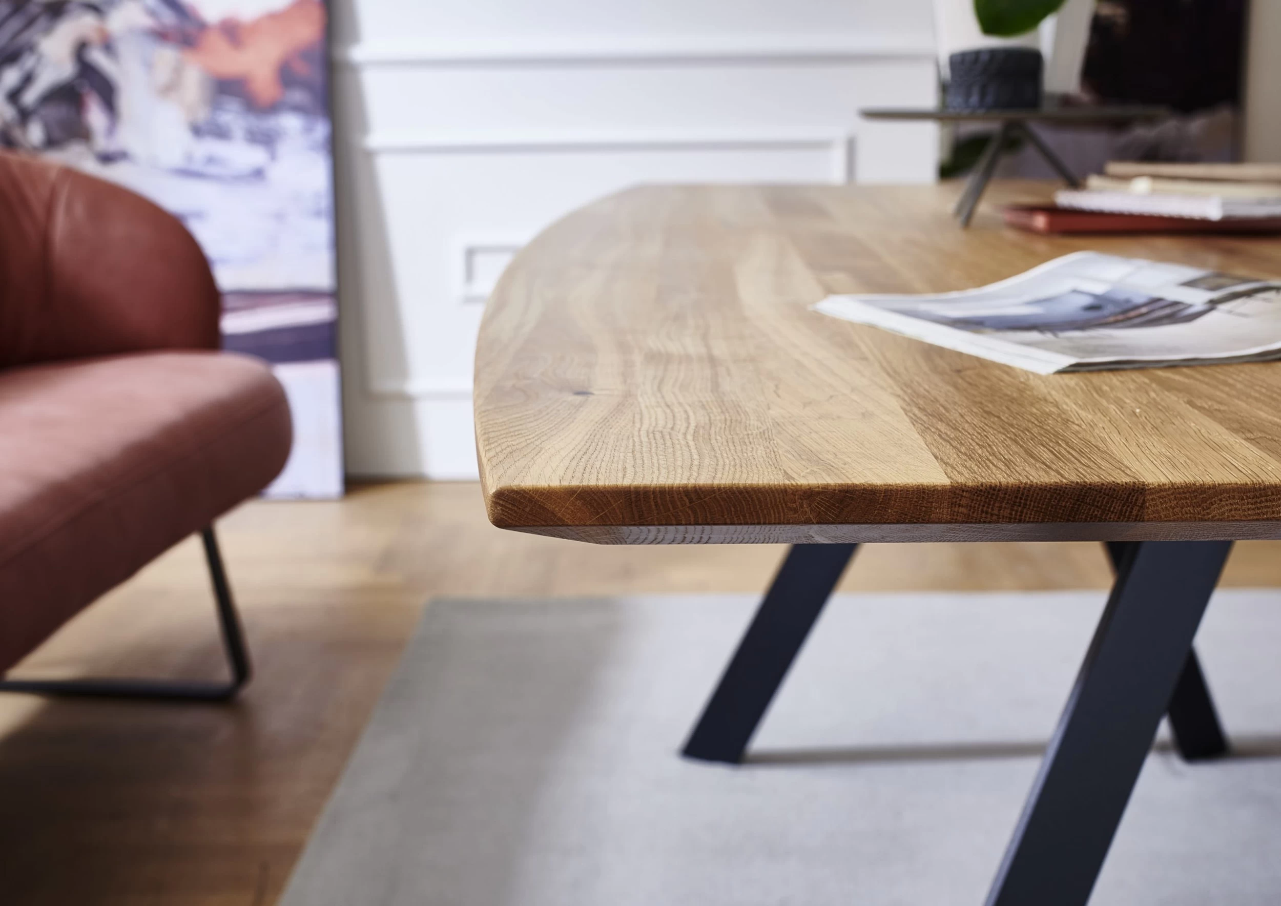Ausführung der Tischplatte in bootsförmiger Charakter Eiche massiv, formschönes V-Gestell aus Eisen in schwarz,