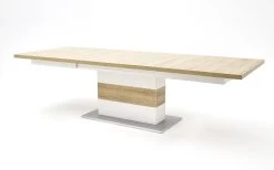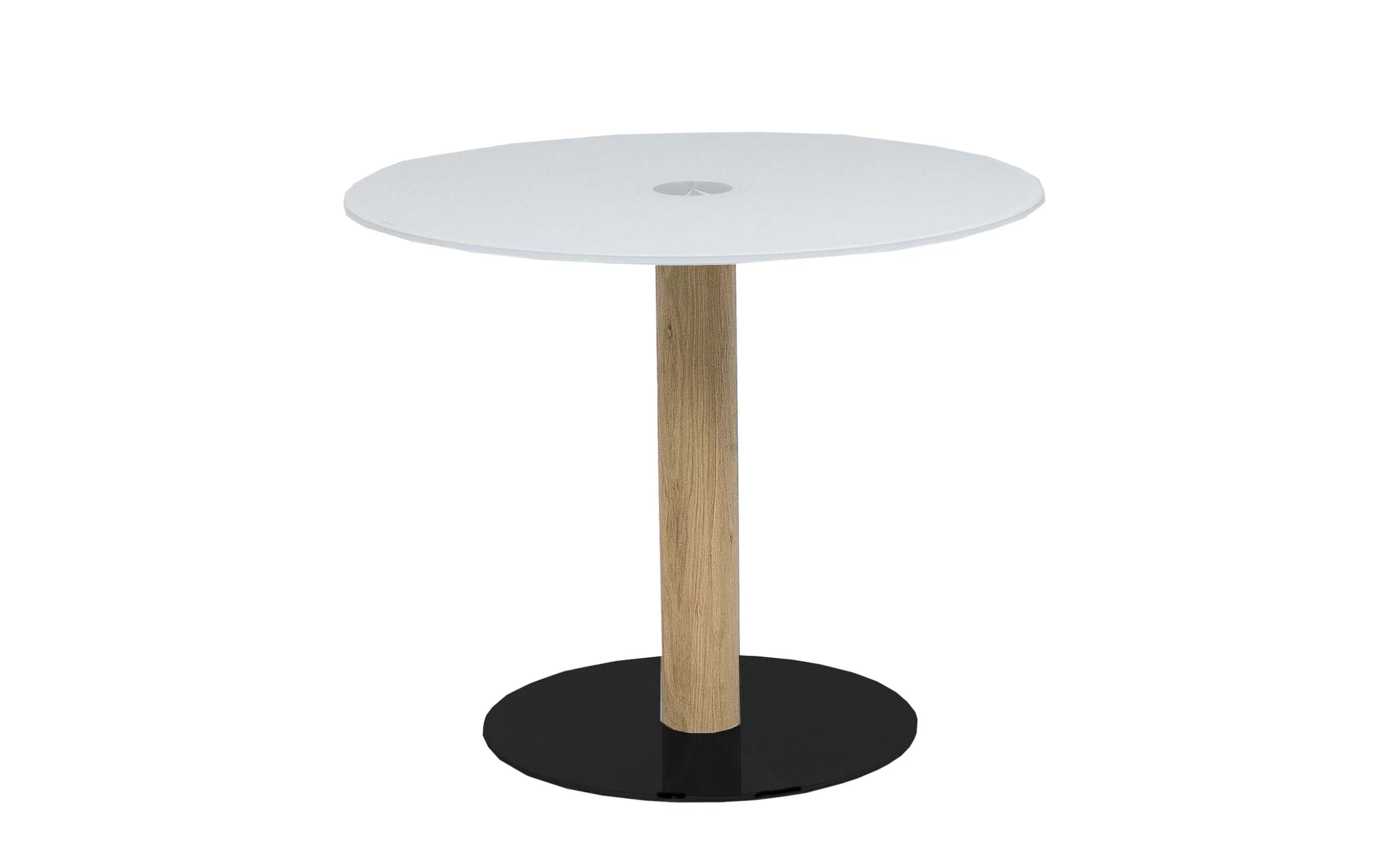Ausführung der Tischplatte aus Glas in weiß, Tischsäule rund in Eiche massiv geölt, Fußplatte in schwarz,