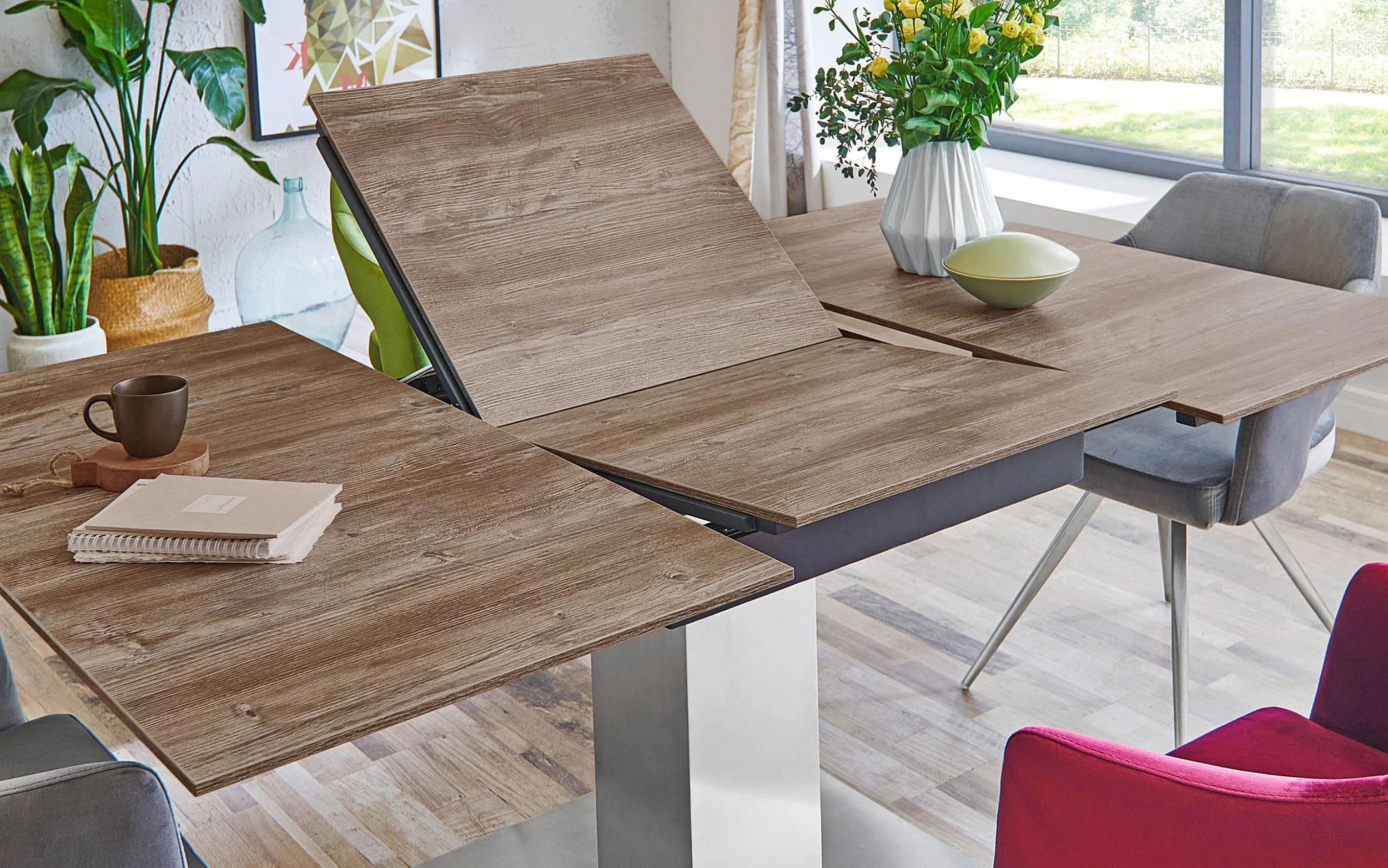 Ausführung der Tischplatte in Boston Eiche-Nachbildung, Säule aus Edelstahl, inklusive Mittelauszug,