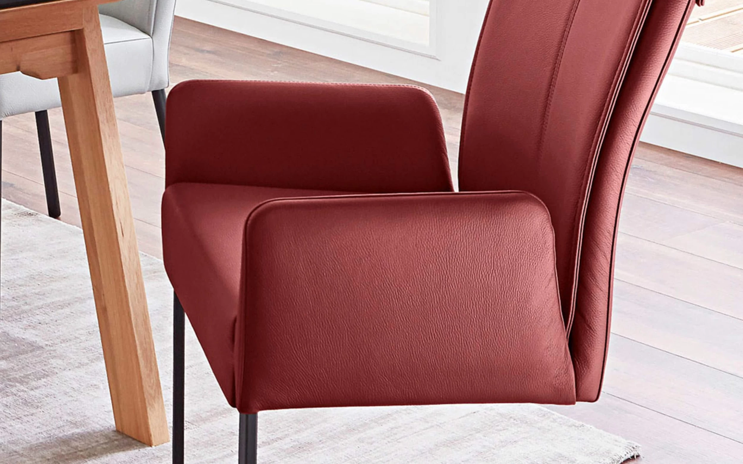 Ausführung mit Bezug aus Echtleder Napoli in rubin, Flacheisengestell in schwarz matt, Rücken mit Polsterdoppel und Griff, Sitz mit Gurt-Federung, praktische Armlehnen,