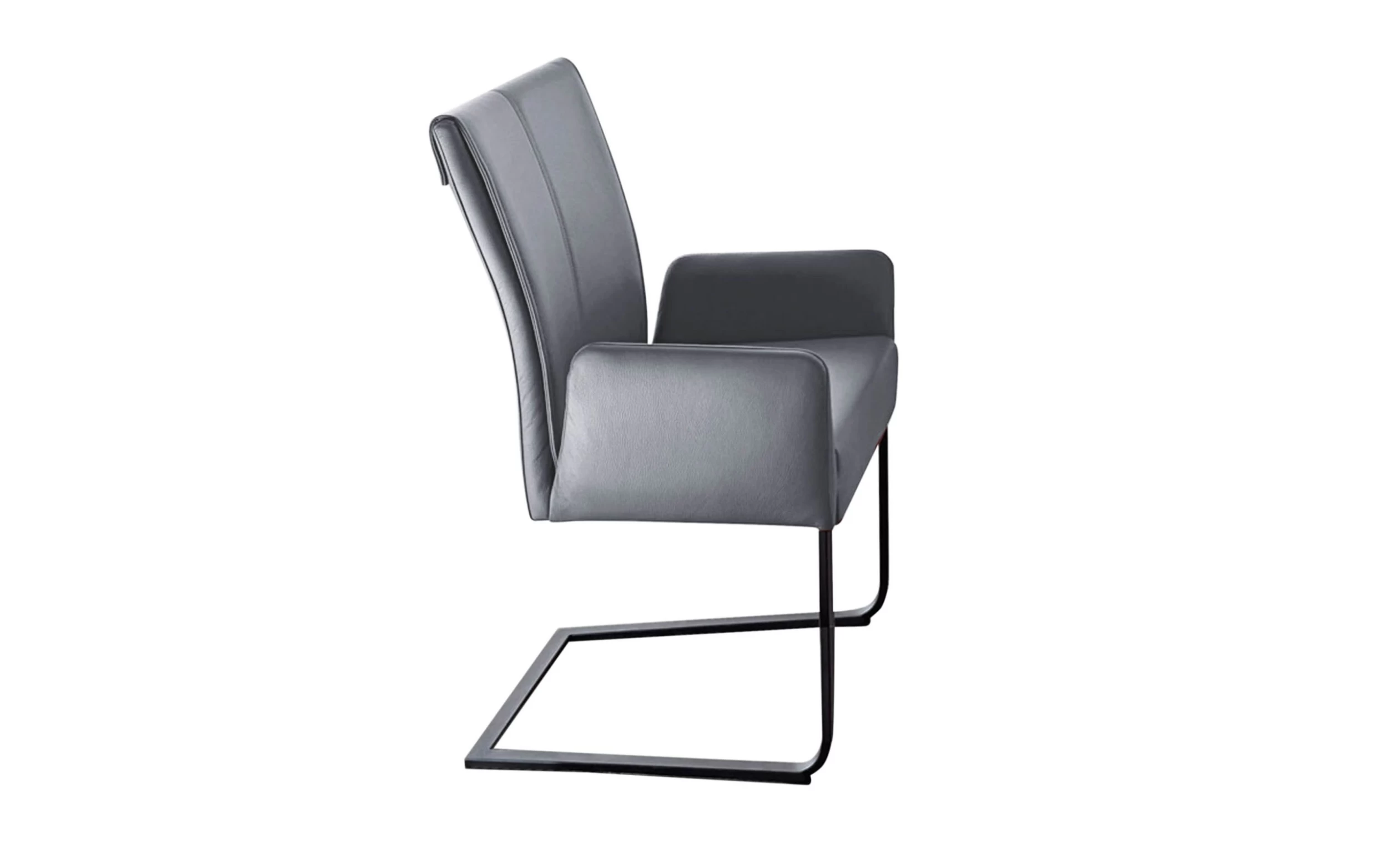 Ausführung mit Bezug aus Echtleder Napoli in schiefergrau, Flacheisengestell in schwarz matt, Rücken mit Polsterdoppel und Griff, Sitz mit Gurt-Federung, praktische Armlehnen,
