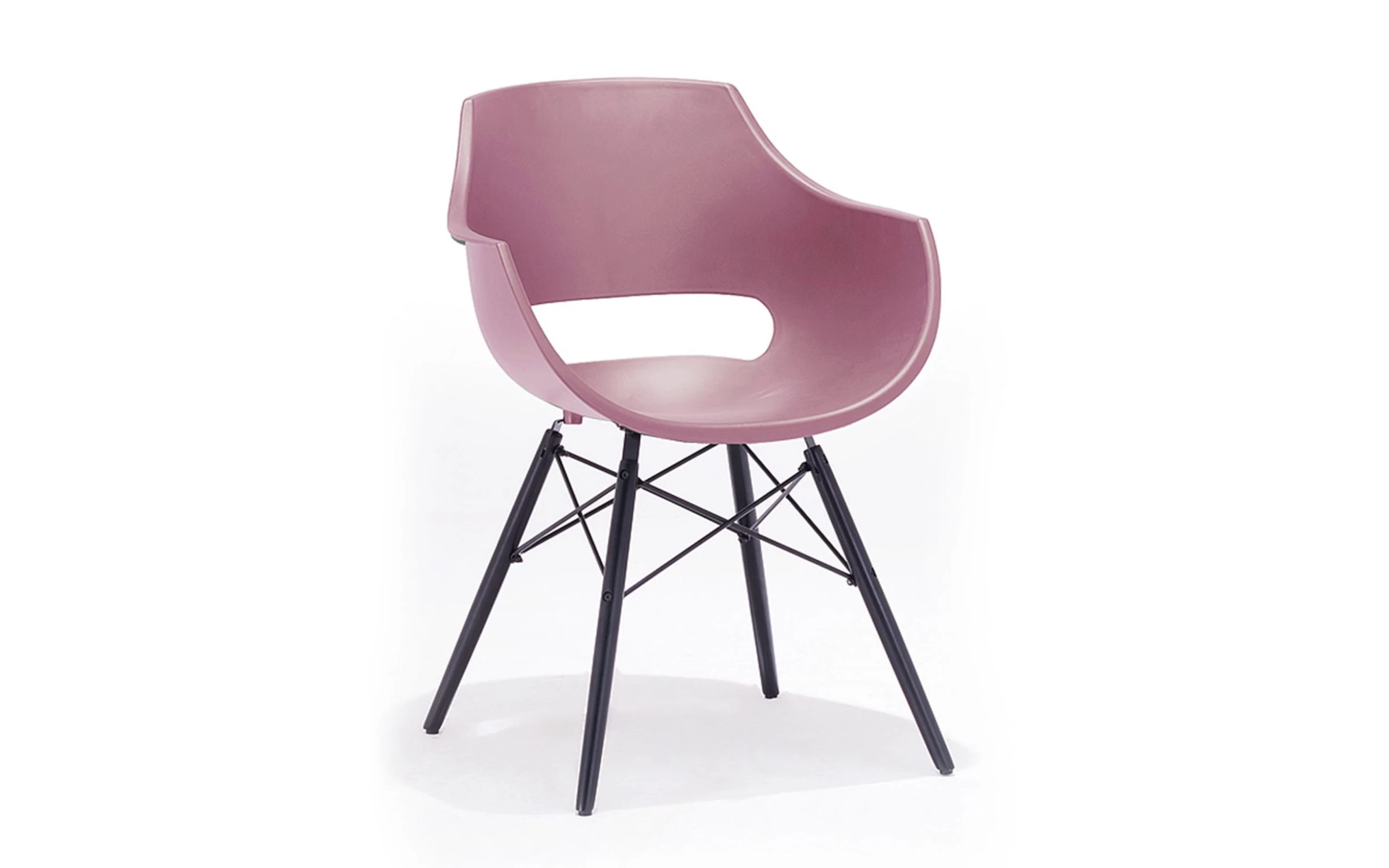 Ausführung der Sitzschale aus Kunststoff in rot, Gestell aus Buche in schwarz matt lackiert,
