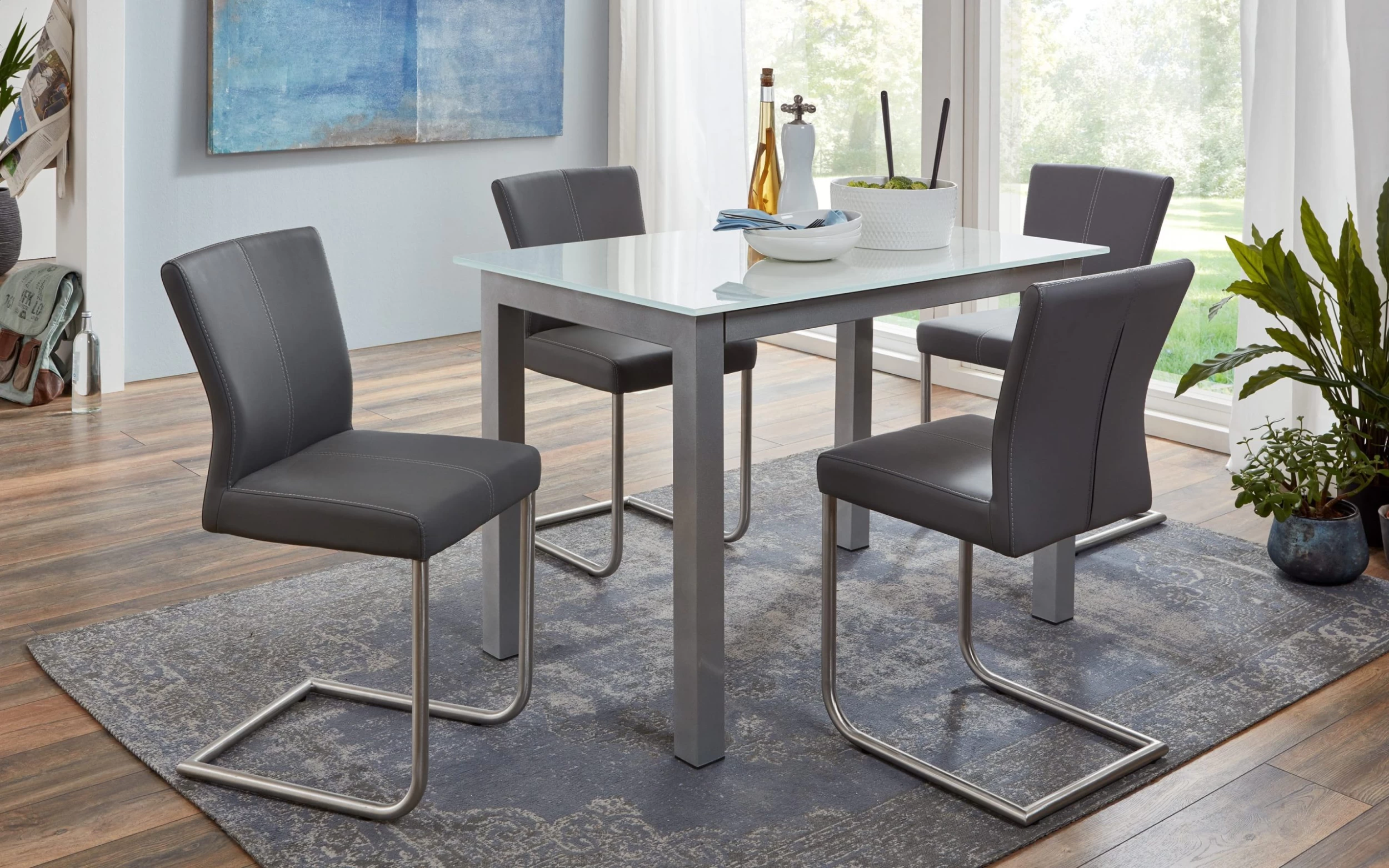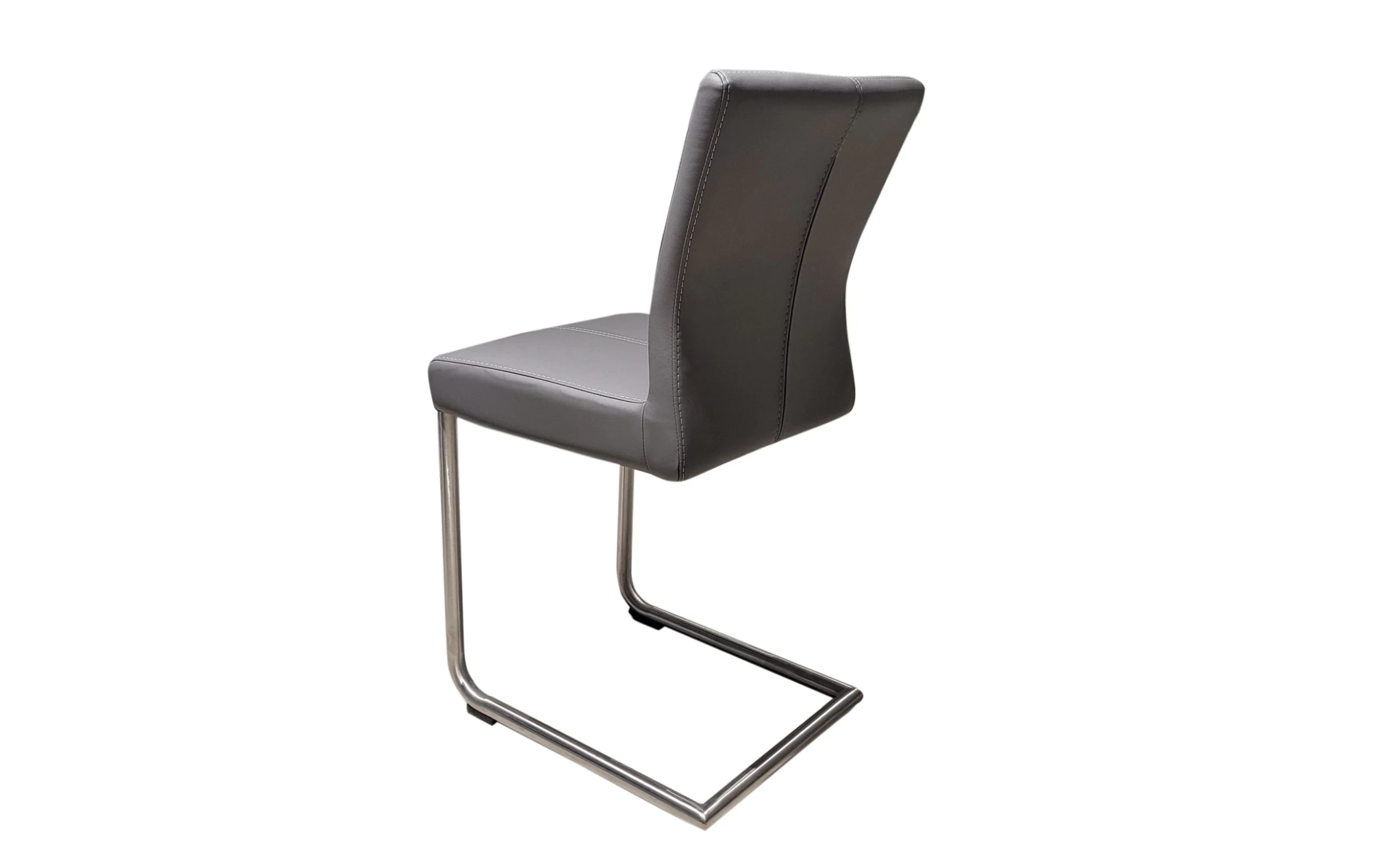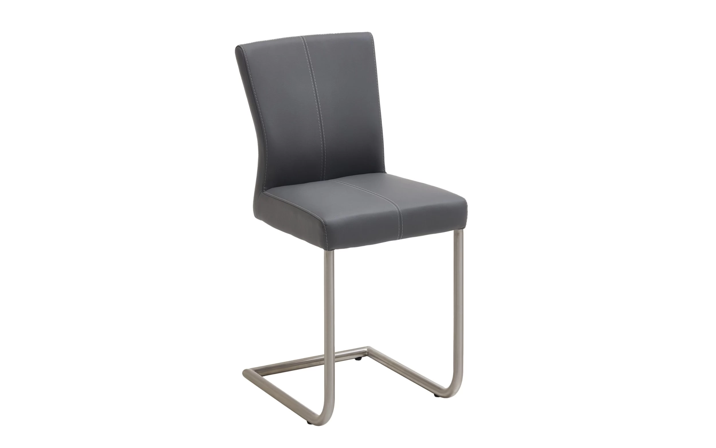 Ausführung mit Kunstlederbezug in grau mit Kontrastnaht in weiß, Gestell in Edelstahl.