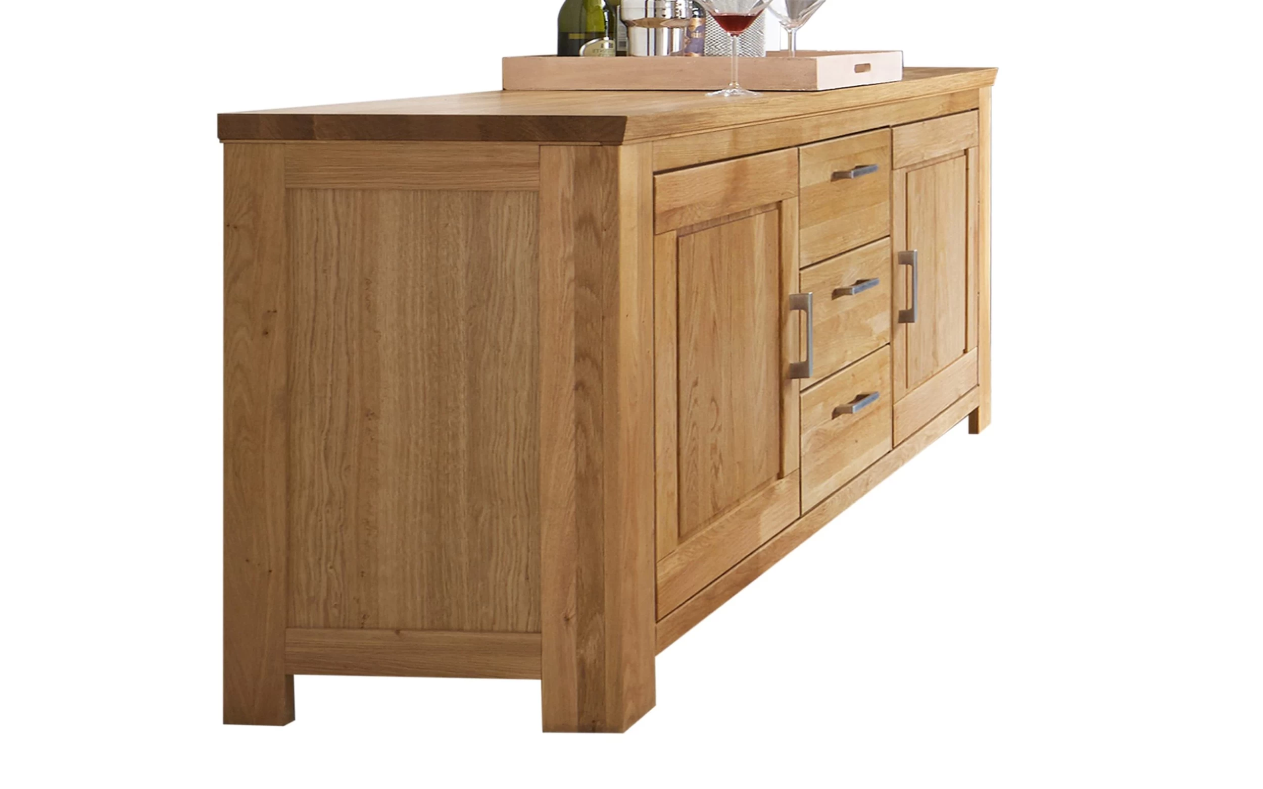 Front aus Wildeiche massiv geölt, Korpus Wildeiche furniert, 2 Türen und 3 Schubladen mit Selbsteinzug,