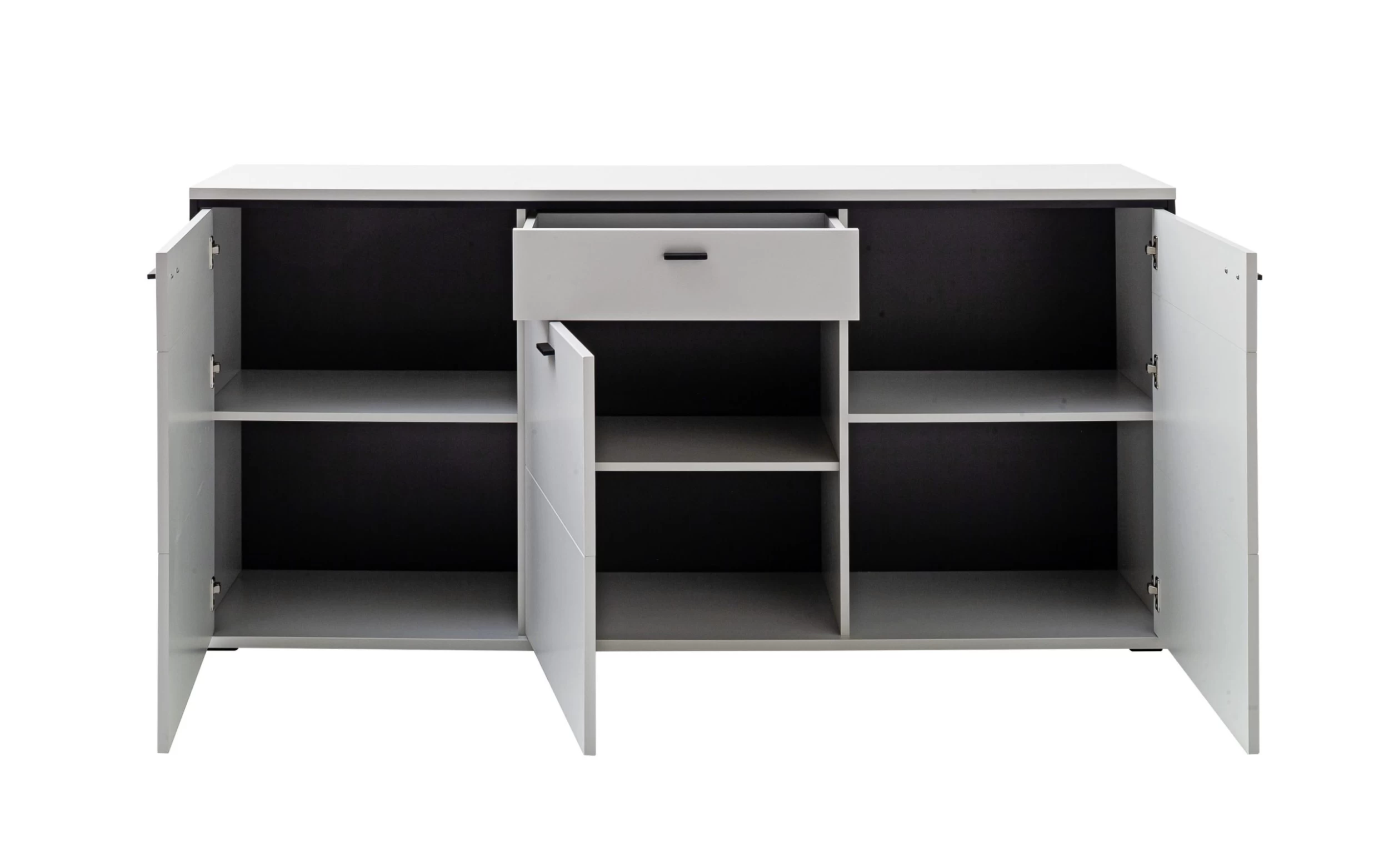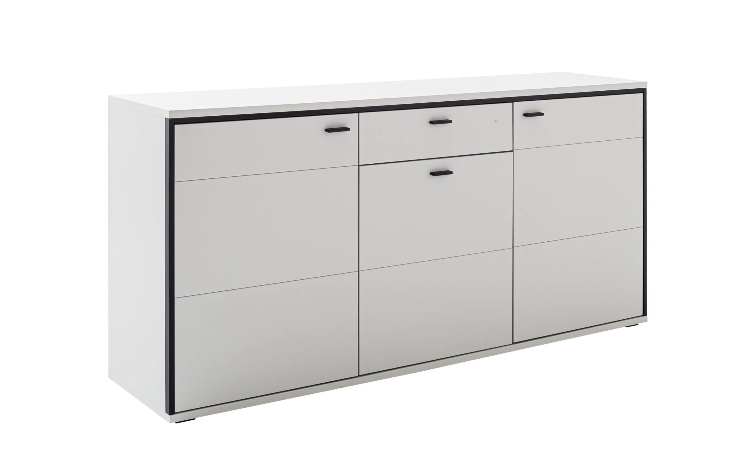 Ausführung mit Front in Modern weiß tiefzieh Nachbildung, Korpus in Modern weiß Melamin Nachbildung / Aluminium Profil in schwarzgrau, 3 Türen, 1 Schubkasten, Griffe aus Metall in schwarzgrau,