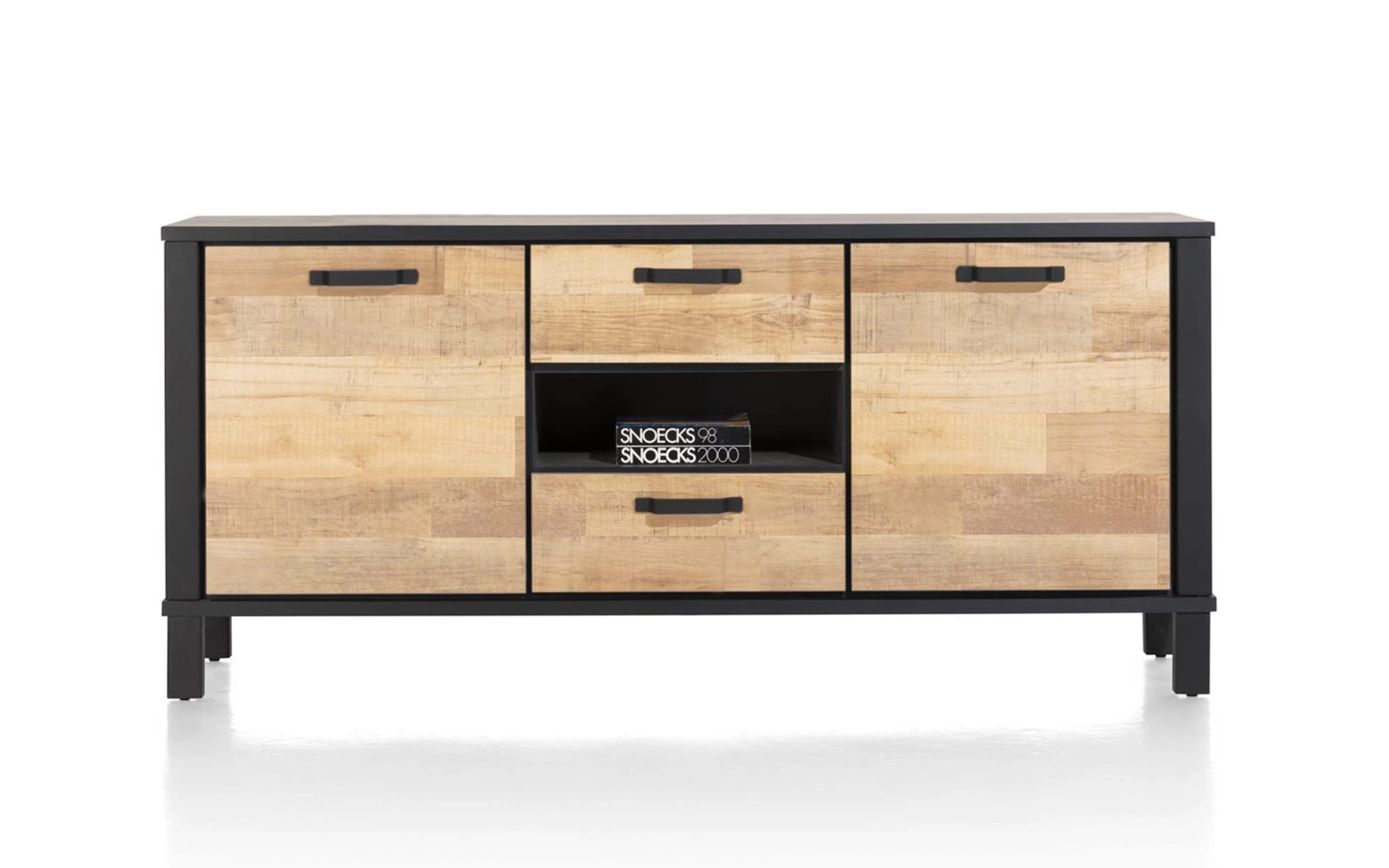 Ausführung in Laminato natural vintage, formschöne Griffe und Gestell aus Metall in off-black, 2 Türen, 2 Schubkästen und 1 offenes Fach,