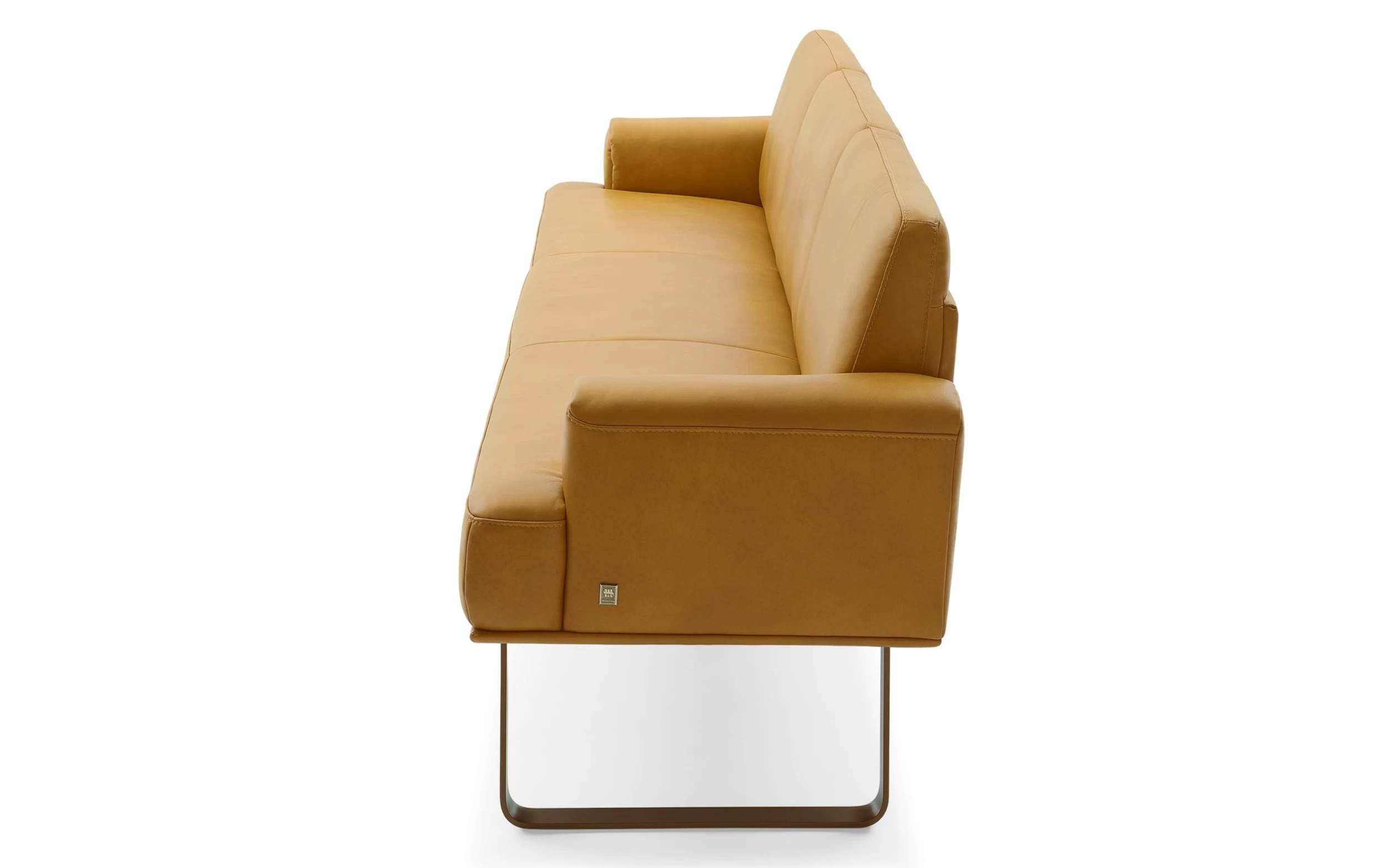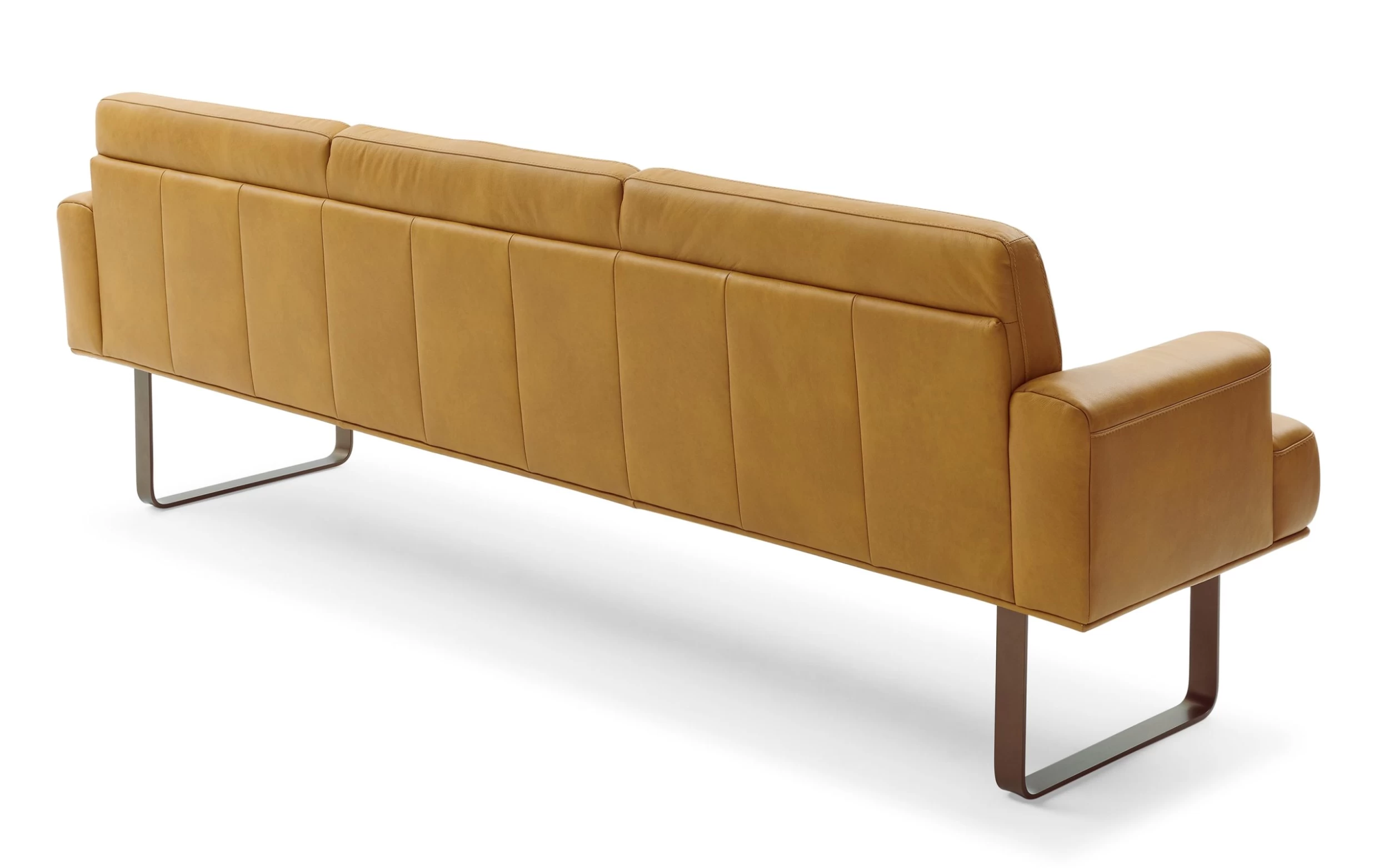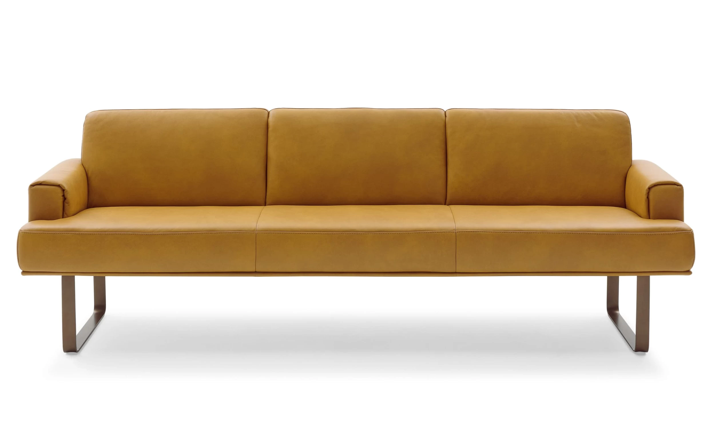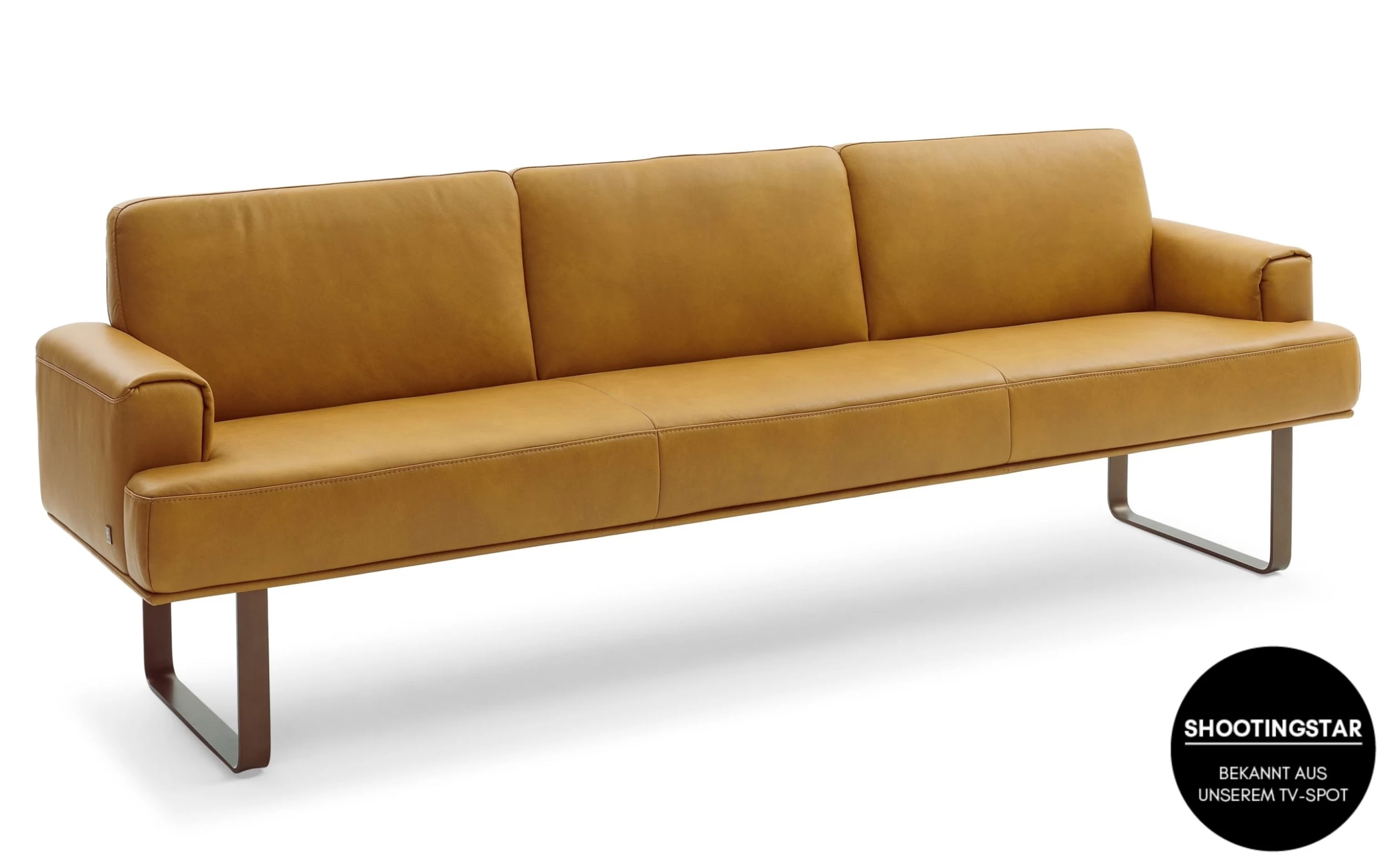 Ausführung mit Lederbezug in kurkuma und edler Kontrastnaht, stabile Kufen in Metall FQ7/M56 bronce,