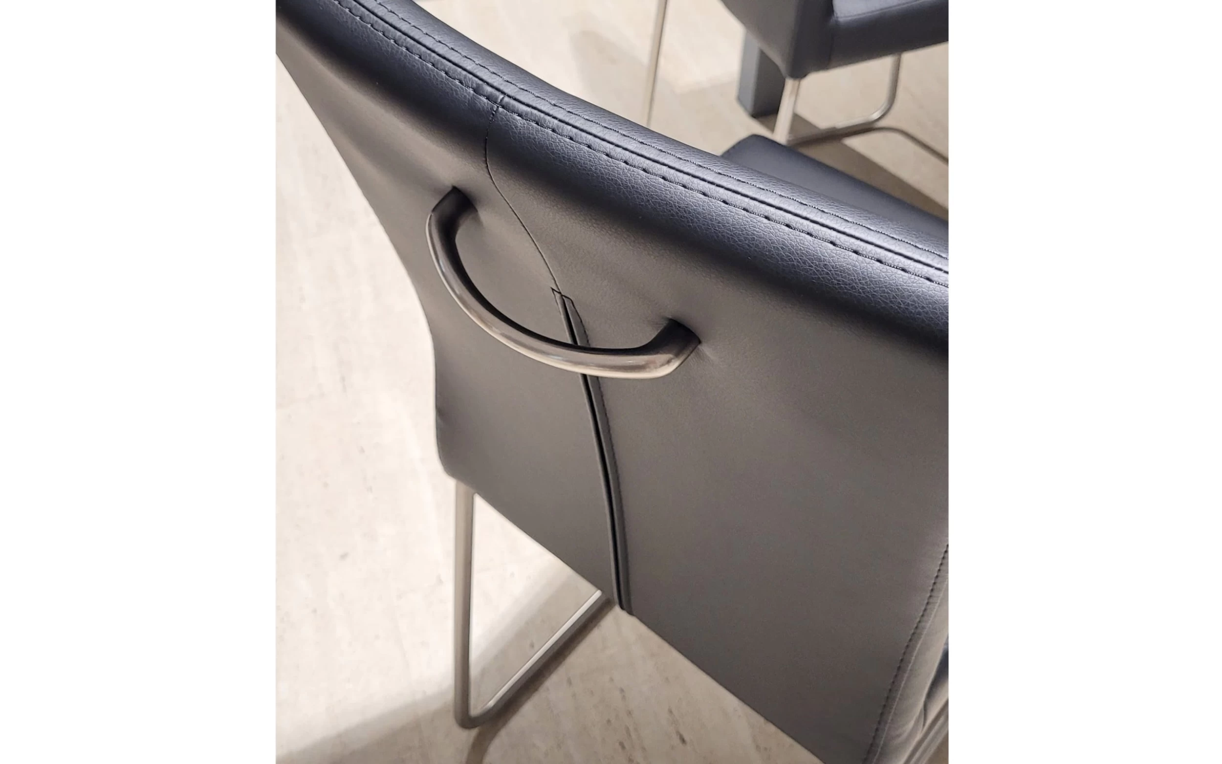 Ausführung mit Kunstlederbezug in schwarz, Kontrastnaht in weiß, Kufengestell in Edelstahl, praktischer Griff in Edelstahl,